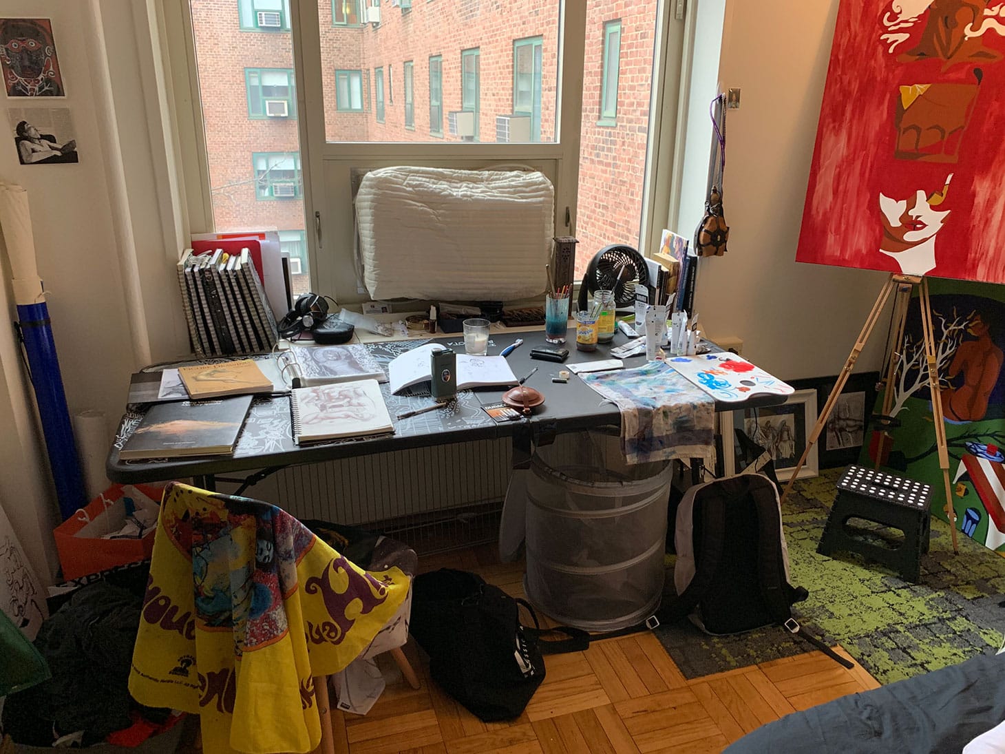 My name is Alejandro Otaola. I am a young artist from Venezuela, living in the Lower East Side of Manhattan. I have been drawing obsessively all my life and have taken to scaling up my creative process with the use of bright colors expressed in my paintings. For this, I need a studio that supports a good drawing space, complete with drawing books, stacks of sketchbooks, and artistic inspirational books (seen on the left side of the picture), as well as a painting section (right side), with a canvas — any canvas stand I can afford — and paints.
