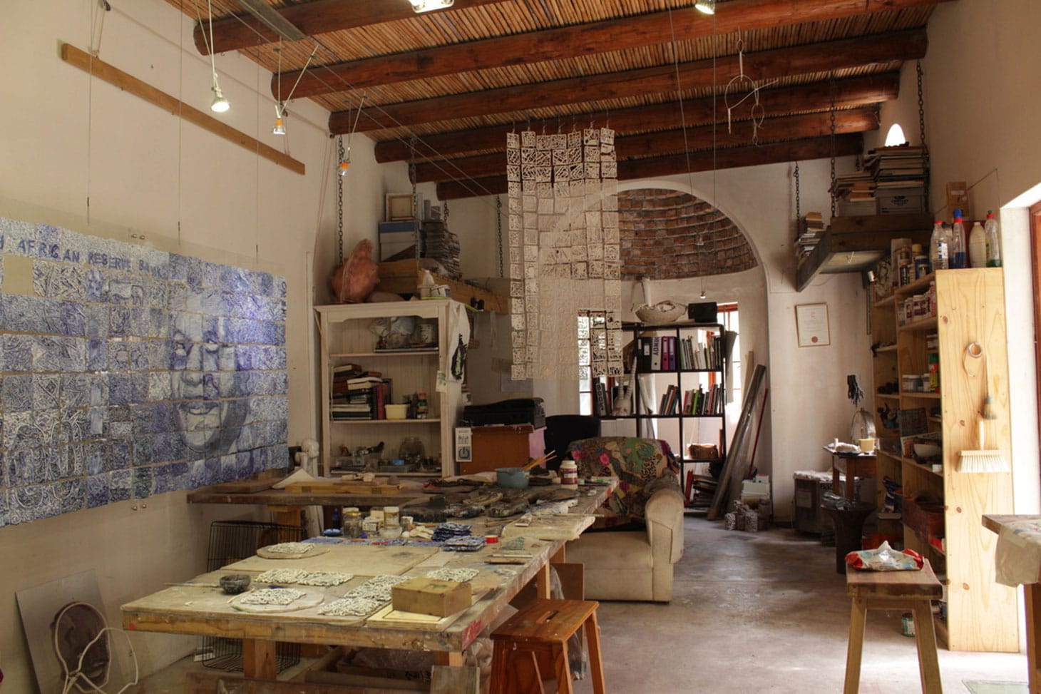 My studio is in Noordhoek, 30 kilometers outside of Cape Town. It was built in 2000 as a workspace, so it is well suited to the range of materials and processes I use in my art making practice. I have a small test kiln as well as two large tables to work on, dry clay, and assemble pieces. I work with moulds so I can work with messy materials like slip casting clay and plaster of Paris. It also is a special sacred space to me, as I can mull, meditate, ponder, and day dream in my comfortable chair and get inspired. Outside, I have a mosaic pathway that leads to the house, and outside the door to my studio I have the word “imagine” written with a small pebble mosaic. I love my space and am extremely grateful for it.