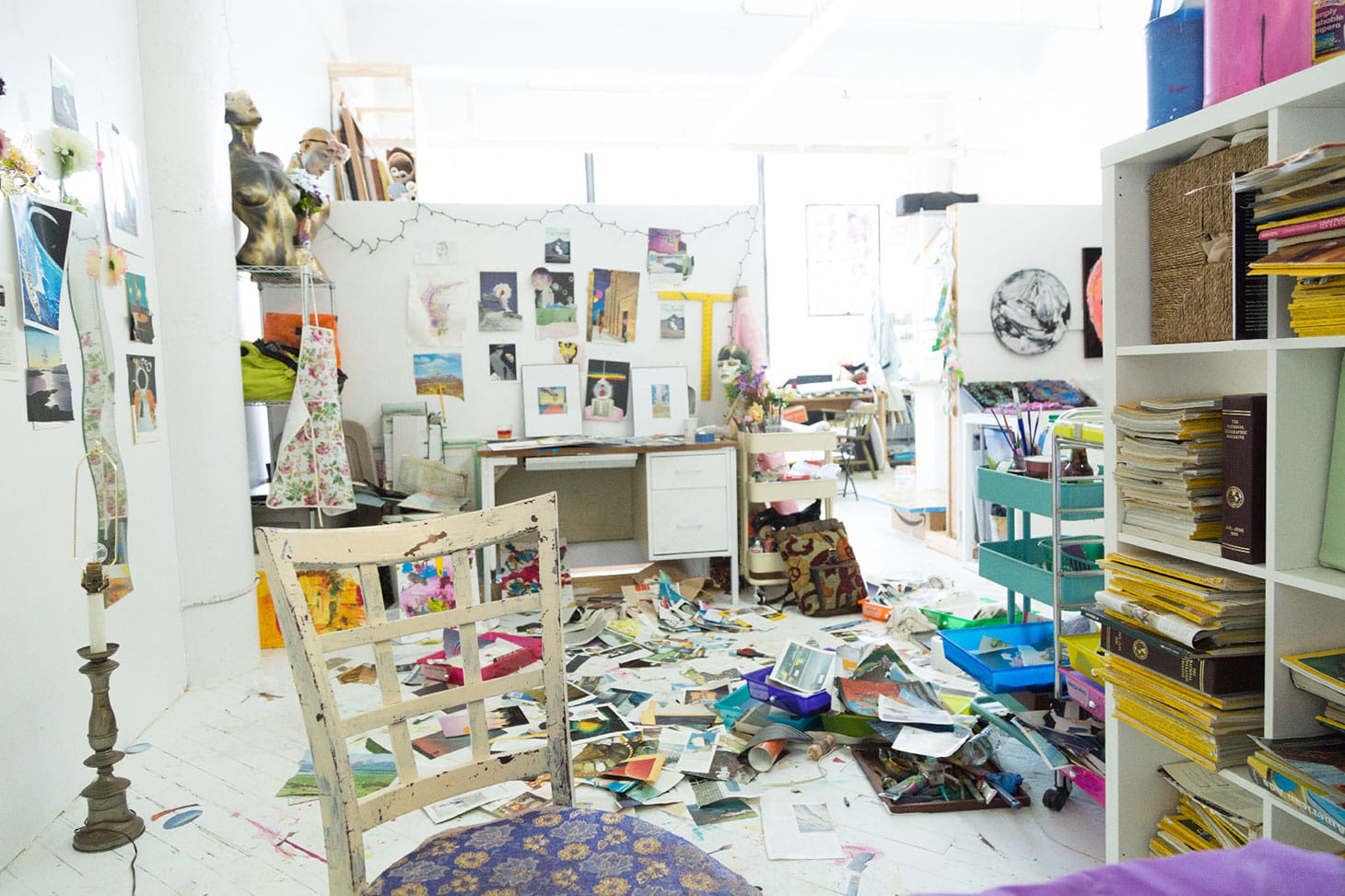 The photo depicts what my space looks like when I make a collage. The messiness is a direct metaphor for the messiness of the expansive inner world that I investigate in my work. Collage as a medium is inherently similar to the unconscious as it layers pieces like the psyche stacks experiences. To explore this relationship in the most natural way, I apply an automatic process. Ripping out hundreds of vintage magazine pages without organizing my thoughts, I spread out my finds on the floor. While drawing from my own unconscious, the shared studio space, along with using found material, supports a picking process that is connected to a collective consciousness. The method of initial expansion ultimately leads to contracting all the stimuli into an integrated form, the actual piece. Reassembling the set of materials, or experiences, I juxtapose what doesn’t usually go together, allowing the psyche to re-understand itself.