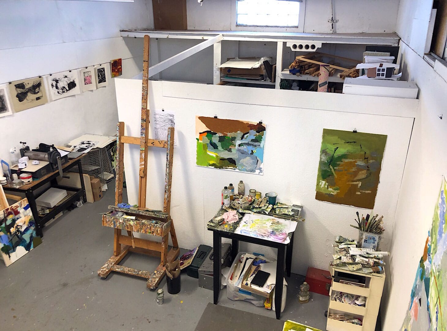 This is a shot of my studio at the Bakehouse Arts Complex located in the Wynwood Arts District of Miami, FL. You can’t see me, but I’m standing on top of my mini-fridge in the corner. What you can see is the easel that I’ve had since 1996. I still use it, but I also like working on the wall. Arches paper for oils allows me to work big, but save on space. The area behind the partition is storage, and that is filling up. My etching press is visible along with some prints I recently made using a water-based lithography technique.If you look really carefully, you can see a pink cylinder coming up from behind the partition.