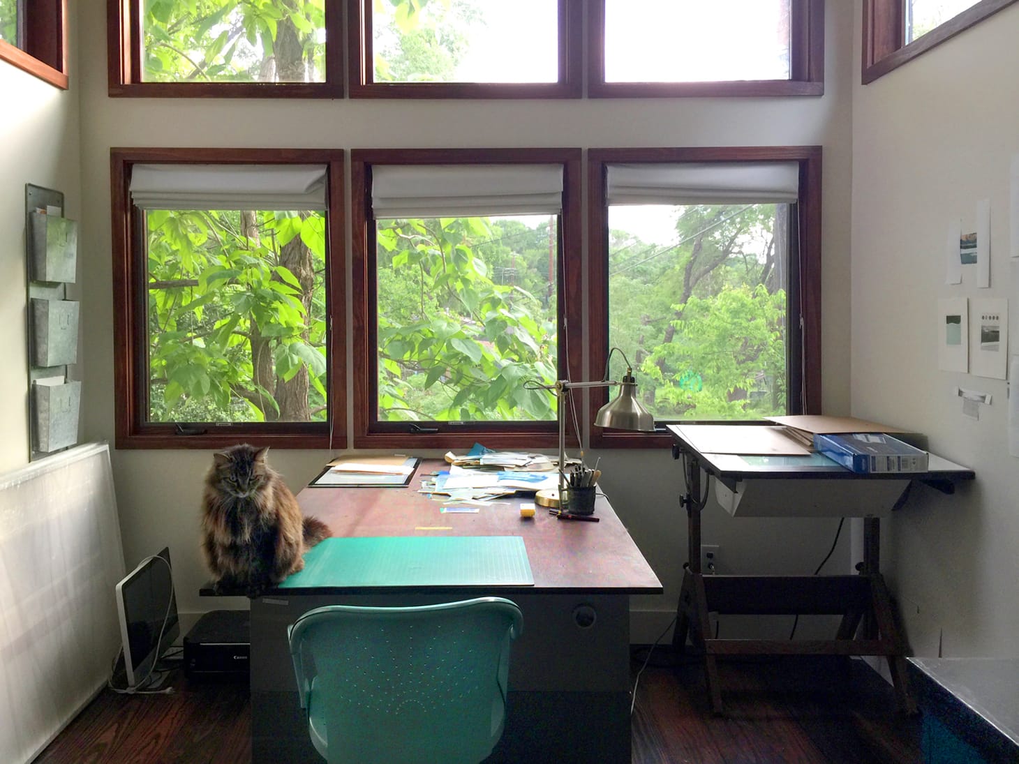 Integral to my small house design was ensuring a light-filled, efficient space for my art practice. Built on a small plot of land, the house is composed of two compact stories; this view depicts the studio portion of the upper story. The room is filled with diffuse northern light from the handmade clerestory windows installed in the vaulted vertical space. The feeling of the space is one of a lofted treehouse, with fluttering green light passing through the canopy of the catalpa tree outside, and flashes of various birds moving through the branches.