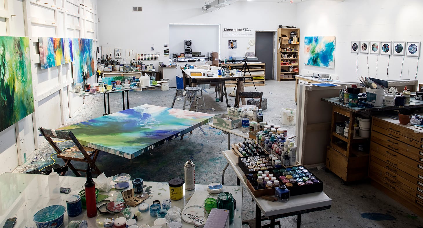 My studio, on the first floor of our home, which my husband and I converted from an office building in the heart of Philadelphia, satisfies my need for a space I can visit day and night. It’s large enough for viewing multiple projects. This shot, taken in spring 2018, depicts work in preparation for Endangered: From Glaciers to Reefs held at the National Academy of Sciences in DC from August 2018 to January 2019. After spending January in American Samoa and Hawaii, I returned to embark on a totally new body of work about coral reef ecosystems. Not only was the content a departure from my past focus on glacial melt as an indicator of climate change — but so was the material and methods I chose to explore: acrylic paint, horizontal painting and a compressor to spread the flows.