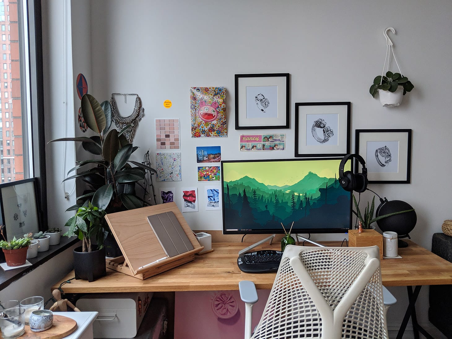 This is my little paradise. I grew up drawing and painting in my study, taking up lots of space on a big table. When I moved to NYC, I no longer had that space. I had to majorly downsize my creative environment and my surfaces. I taught myself how to draw on my iPad, so I could continue to pursue art whether or not I even had a table to work on. When I started itching to get my hands messy again outside of the digital realm, I carved out space in my room to make a designated spot. It’s great to not be totally dependent on a location, but even better to know I have such a cozy spot to let the magic happen.