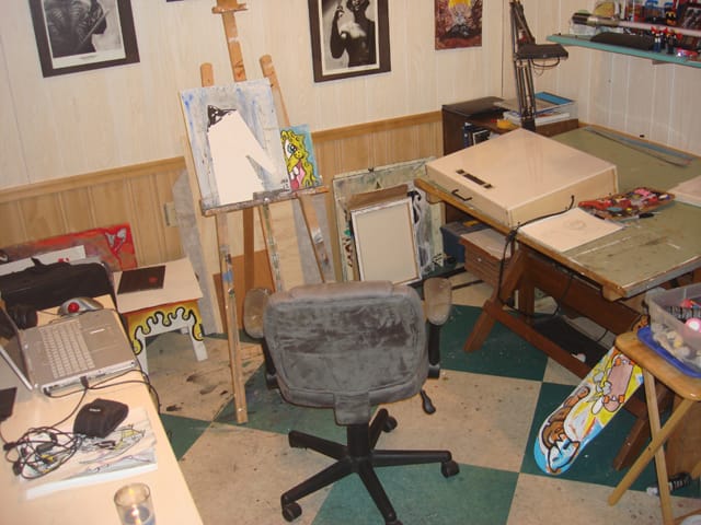 I have my studio set up like a sound engineer behind the consoles. My easel sits in the middle of the room with my computer to the left of me that I use to pull up references or inspiration online. To the right of my easel is my drafting table that I use when I’m drawing or sketching out ideas.