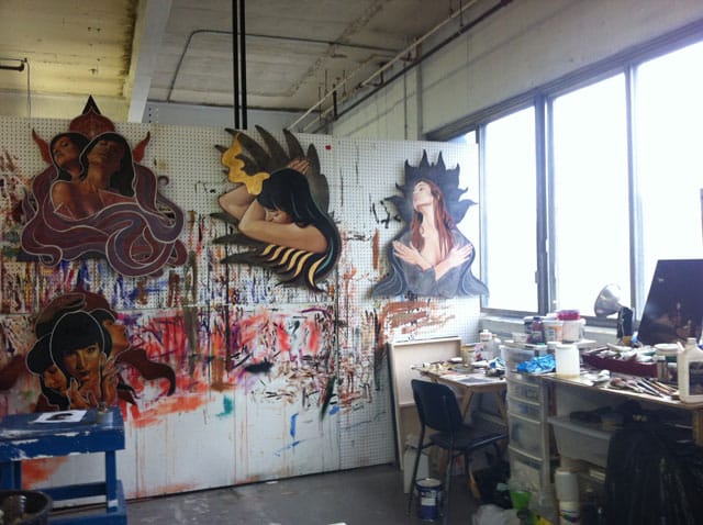 My studio is located in the Plateau neighborhood of Montreal. In this picture you can see the pegboard wall that I hang my paintings on to paint. I have a few of my more recent pieces on the wall. I almost always paint standing as my work usually exceeds three feet in height. My studio space is in a corner section of an industrial building with half the room being windows, flooding the area with natural light. I share my space with a few other artists, which is great for a number of reasons. I have all the space I need and great people around to share resources, talk to, and bounce ideas off of.