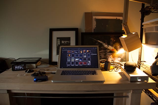 Seen here: my desk (Ikea, $74.90) handmade lamp (Colorado College woodshop, about $8 in parts: poplar, speaker wire, plug & type A lamp base, 5700K CFL bulb, some glue and nuts and bolts), 15in mid-2010 MacBook Pro with upgraded high-res display ($????.??), G-Tech 2TB external drive loading up some photos into Lightroom, various prints, and assorted doodads.