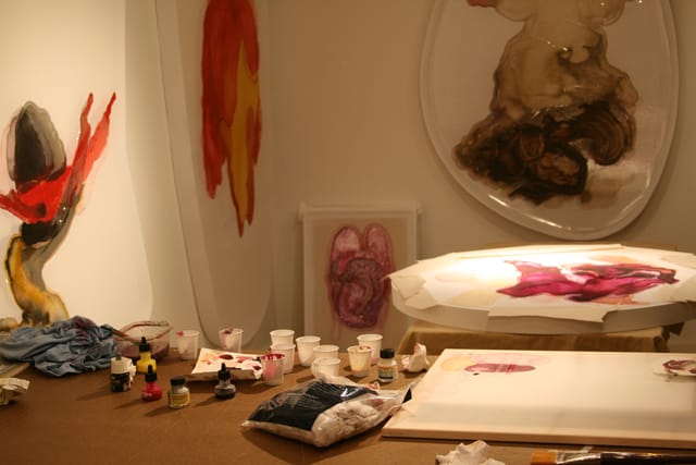 The photo shows finished work and work in progress after a stint at VCCA Auvillar, a residency in France. Being abroad for a residency proved how few materials I needed to create. All possible fancy art materials were reduced to 2 ounce Higgins bottles, tiny cups, and an extravagant bag of scrap t-shirt rags. So when I got home, that is what I stuck with, although the scale grew to being larger than a suitcase.