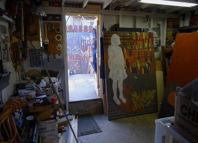 My studio is a bit ramshackle but it works for me. I’m not sure if my methods have evolved around it, or it evolved around them. A converted garage behind my East Bay house serves as a “clean” workspace and office, plus there’s the small workshop you see in the picture where I keep all the messy stuff. The door opens out onto a bare concrete outdoor area which is where I do most of my work.