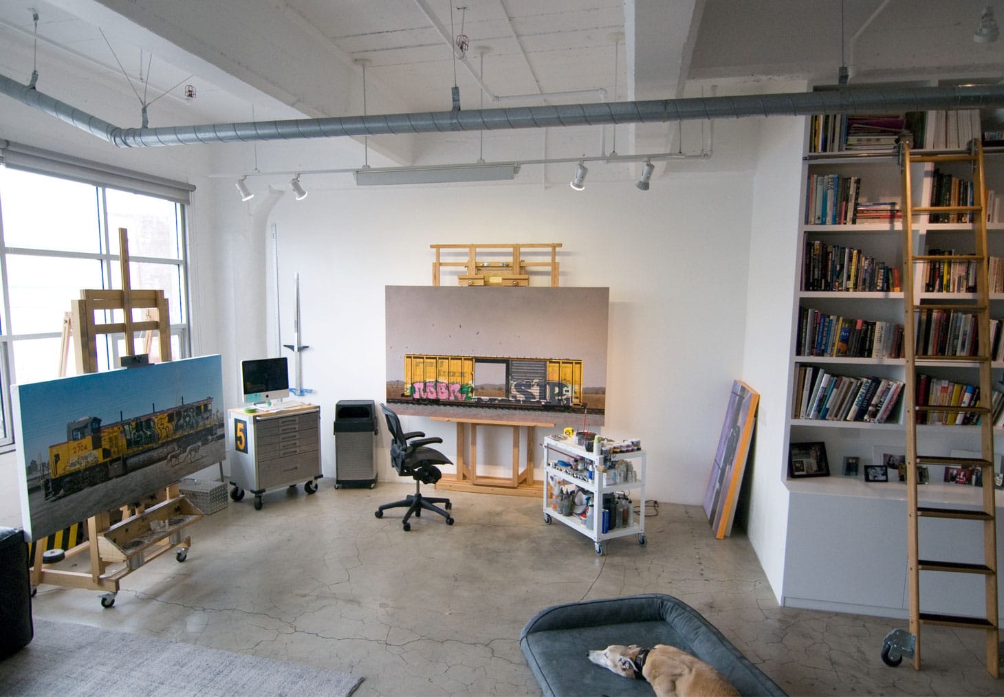 My studio and home are integrated in a loft, located in the Arts District of Los Angeles. Rail activity is central to my neighborhood and also my work. My building was originally constructed as a factory in 1926. A bank of large, industrial sized windows provides ample and consistent light quality, all day long. The central component of my studio is my easel. A Hughes model 4080. My computer is secondary, as I work directly from the screen. I keep a small work table to my left where I sketch and collect the daily mail and a work cart to my right for palette and paints. I have a secondary easel for the occasional heavy workload, but for the most part, I only work on one painting at a time. Being a book nerd, I have accumulated a small collection of books about work — and cooking. Finally, my dog Olive completes my studio. She is a retired racing greyhound and is almost always with me.