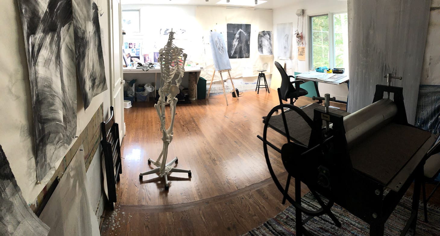 Located by a ravine in Toronto, Canada, my studio windows look out onto a forest and I feel nature’s presence despite the fact I am in the centre of a large metropolis. The studio has a lot of wall space for working on large works on paper and mylar. It also includes a printing press as I often include prints in my artwork by collaging them into my mixed media drawings. The skeleton is an important component of my workspace as my artwork is figurative-based and makes references to the human body. I explore the changing nature of embodiment and the body’s connection to its environment and nature. There are two skylights that flood the space with natural light; the light allows for detailed work and illuminates the transparency of many of the supports that I use. I also call Newfoundland home, and have a studio on this remote island in the North Atlantic. The wildness of Newfoundland and the cultural centre of Toronto both inform my artwork.