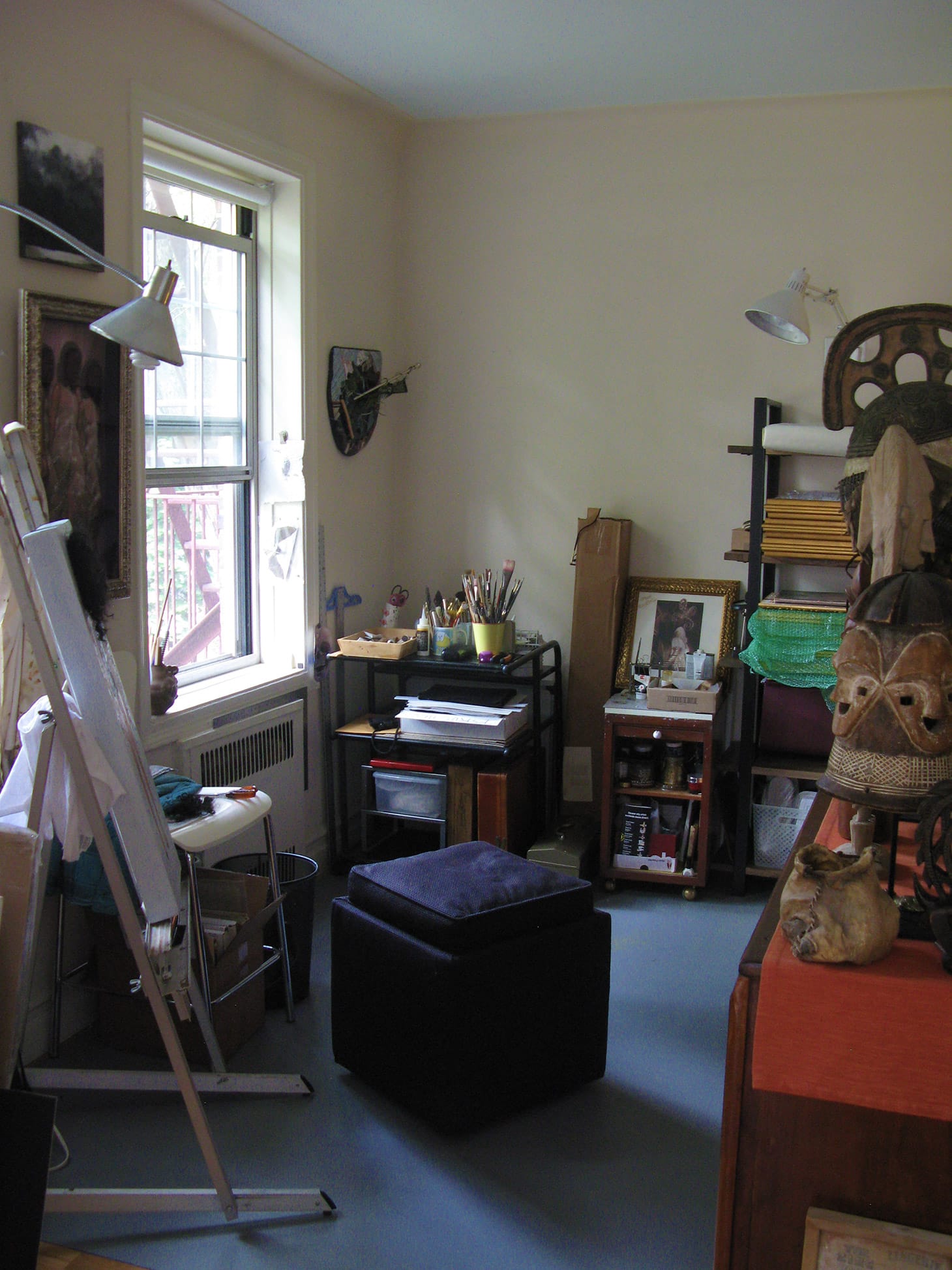 I created a studio practice late in life. I am a degree-holding art historian nearing retirement from academia. My studio is about a 1/3 of my living room divided by an amazing, antique, handmade sideboard with a dozen deep drawers where I store all manner of necessities for my practice or just for my peace of mind. On top of that is a portion of my collection of African art. They are like sentries that remind me of how beautiful blackness has always been represented and how I am a part of that continuum. I once had a larger space that divorce took away, but this more intimate fraction of the whole is a part of my home life whether or not I am making something in it. The windows look out on a garden that is fluid, constantly changing. The natural light encourages me to stay bright in my attitude and my palette. I paint, but when it doesn’t call me, I “make” other things like the gold framed LPs stacking up on the right, as I search for ways to get my art out there and seen by people of color especially women.