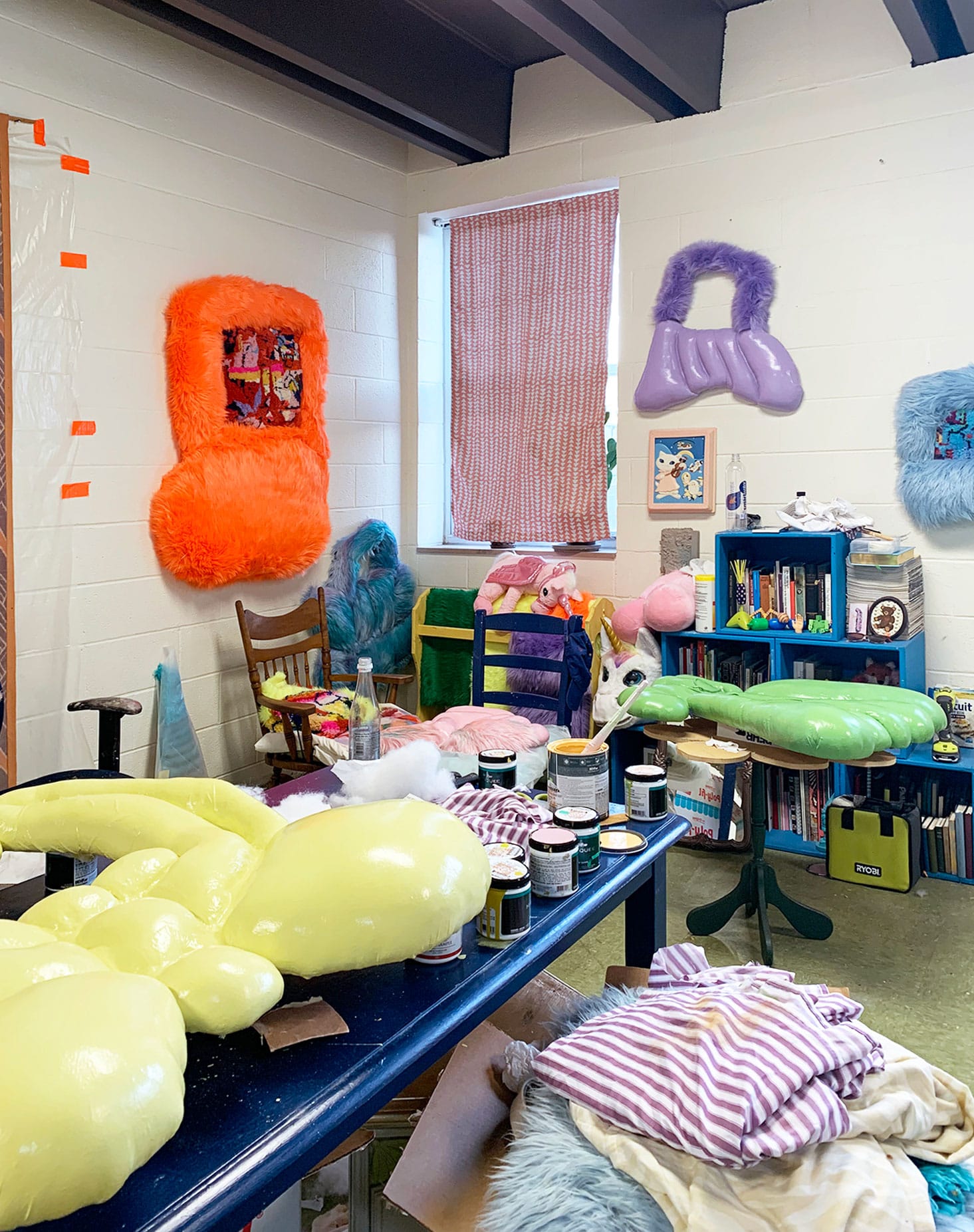 Located in an old classroom in Nashville, my studio is currently strewn with found fabrics, toys and various thrift store finds that either physically become part of the work or serve as inspiration. I often refer to my sculptures as “inflatables” even though they are heavy and not filled with air. Their bulbous, cartoon shapes give them a creature-like presence and reference my interest in childhood identity development. Lately, I have been most interested in using faux fur to build large-scale wall sculptures that almost feel related to stuffed animals or a beloved toy yet retain an unsettling presence.