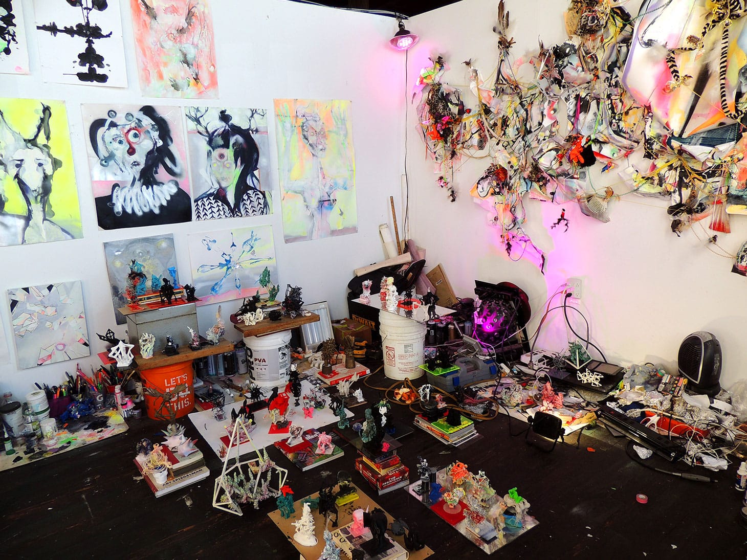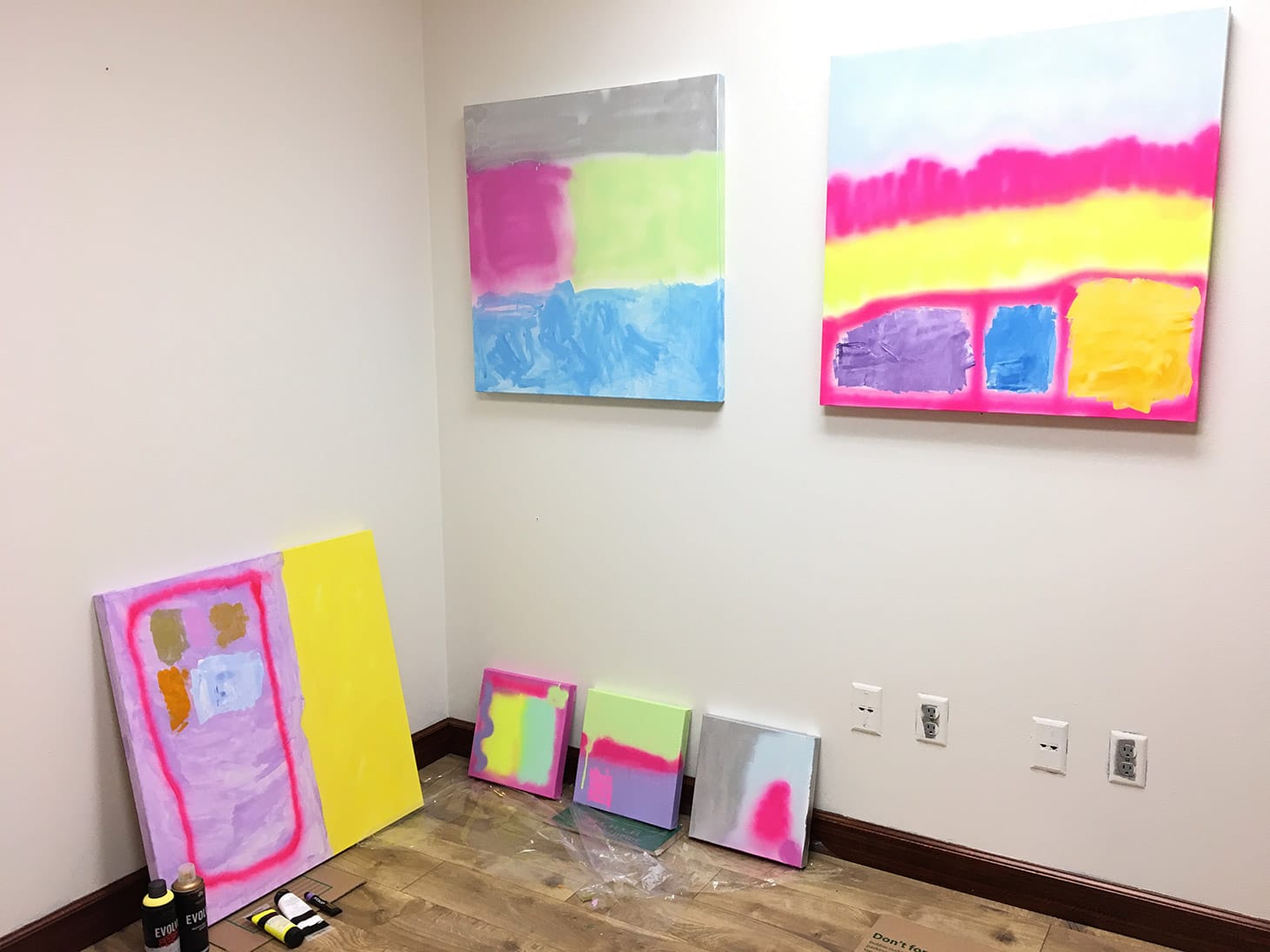 My studio doesn’t have a window, but it does have bright, office-like fluorescent lights. Their harsh hum complements my high-frequency paintings, made of spray paint and acrylic on stretched canvas. I don’t have a table, I prefer to leave as much space as possible for my work.