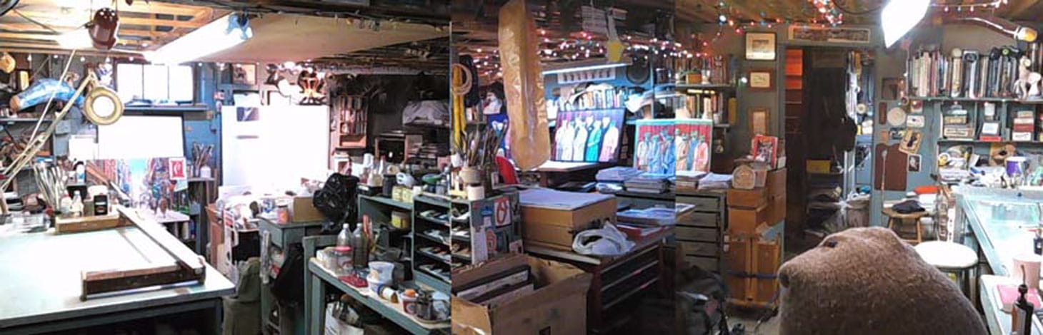 This composite view of my basement studio represents my working space of 20 years. More like a cluttered ‘kabinett’ now, I can still complete my necessary work flow. There is a separate room for wood working, dusty carving and framing chores. On the left in the picture are several painting areas. The center pile conceals a large antique “japanning press” which is successful at printing nice-sized plate lithographs and etchings. The far dark corner has several sound systems. The mid-center back table I use for bookbinding and layout chores. The right-hand side has a large glass drafting table. In the basement of my house the spirit-lifting commute is only downstairs. I control light here with a Kelvin-balanced array of assorted light stations. And although I acquired the house for the dry basement, it is not heated and for five months I am chased out by numbed fingers; Still, this is my sanctum sanctorum.