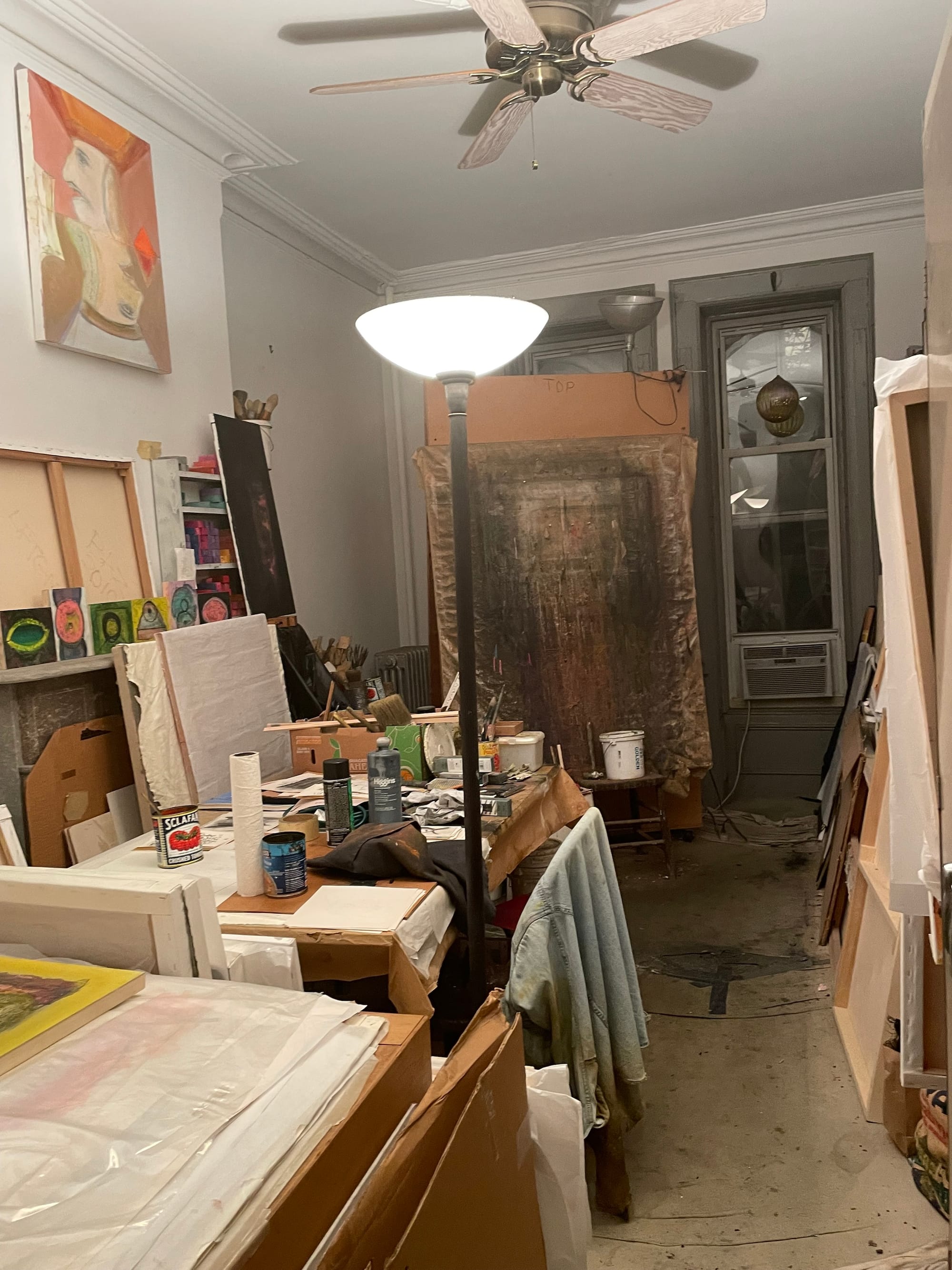 My studio occupies the front room on the parlor floor of our 17-foot-wide row house in Park Slope, Brooklyn. In this image, you are seeing my current studio without work on the well-used easel. In the past 20 years, in addition to paints, I’ve used a variety of materials including colored oil chalks and molding paste that build texture and create depth in my works on canvas, paper, and board.
