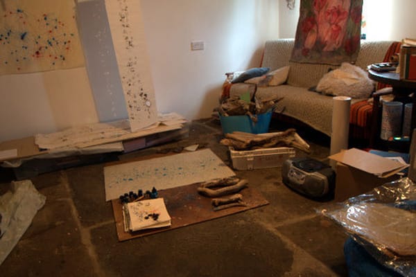 There is nearly always music in my studio. Two unstretched canvases of dresses and roses hang from driftwood and another one out of view, though these are pieces from a different body of work. The stone floor is covered in driftwood that I collected from the beach. I have been going to our local beach a lot lately, I find it really inspiring, and always come back with more things I find as well as ideas.