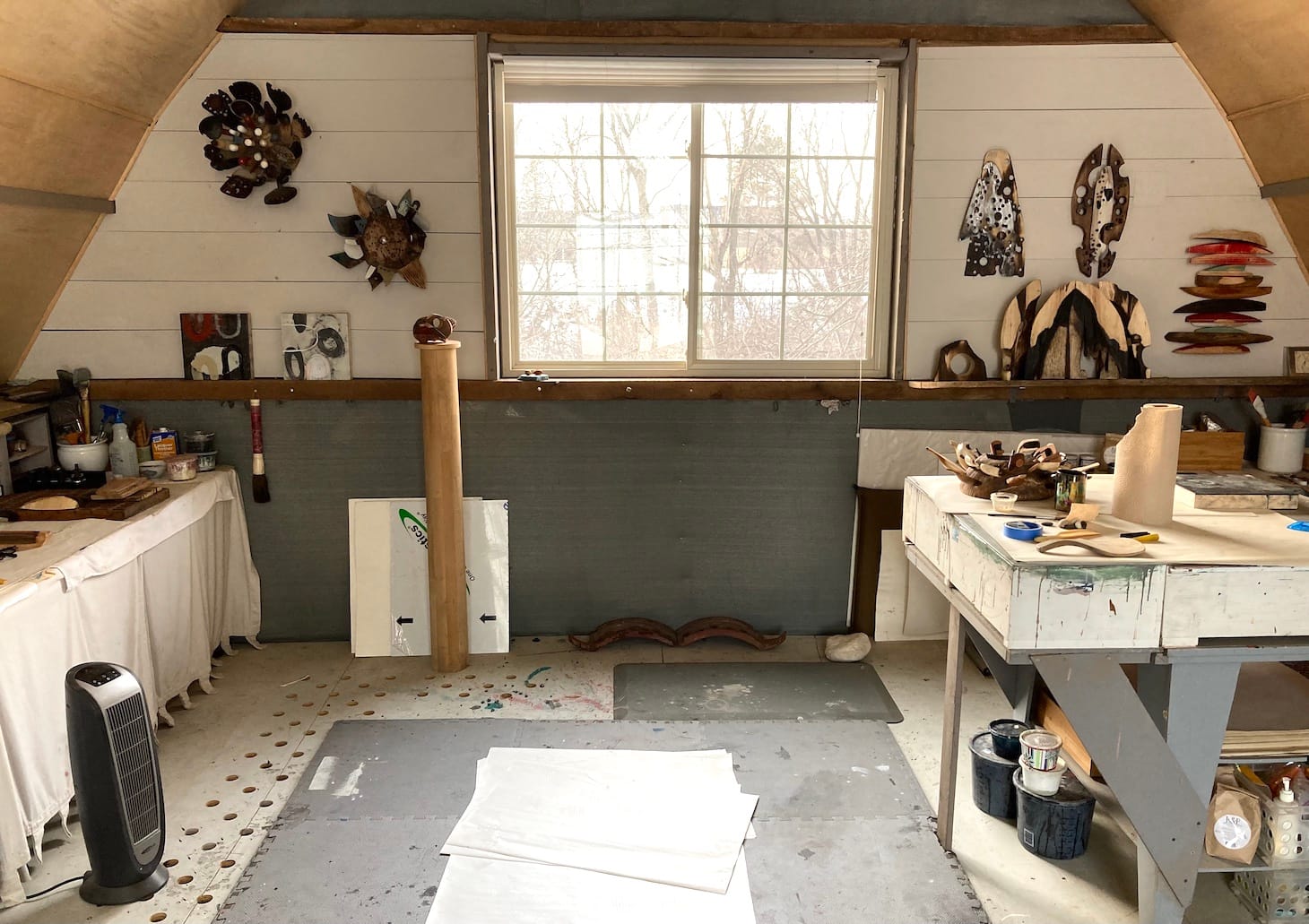 My studio was once the hayloft of a barn, built in 1890, on a small creek in Michigan. After clearing away the raccoon nests, adding a new floor and two large windows, my studio become my most precious sanctuary, especially during Covid, when being creative was a much needed antidote to isolation. I am in a perfect setting in rural Michigan as I have access to the woods right out my window and the creek below, which offer me moments of repose, inspiration and meditation. It is also a perfect setting to work on my current series of assemblages, which you can see on the far wall. Their components are often local found objects, barn wood, or forest detritus.