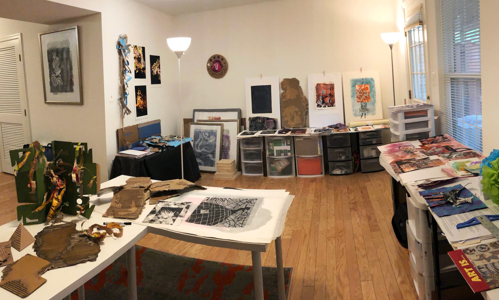 My studio was my sanctuary during quarantine and provided a quiet place to reflect, cry, and brood during those unsettling times. It also was a space of energy and possibility where my creative ideas could percolate, unfold, and manifest. I was grateful for the time to immerse myself so fully in my art, and to use the materials at hand for printing and collaging. I was led to create a series of 8 x 10” gelatin prints “We Can’t Wait” that reflected Black people’s plight in America, and the demonstrations against police brutality exploding across the nation. The stark, abstract black and white prints grew from my need to DO something. I also found myself returning to sculpture made from reclaimed cardboard, a material I gravitated to because of its association with the disenfranchised, and created new works torn and peeled from boxes already in my studio. These works I’m hoping will challenge us to envision a new way of being for ourselves and our world. These were the worst of times with so much death from Covid-19, racial violence, and hate, but somehow a wellspring of creative energy emerged for me, that seemed to make the imagined possible.