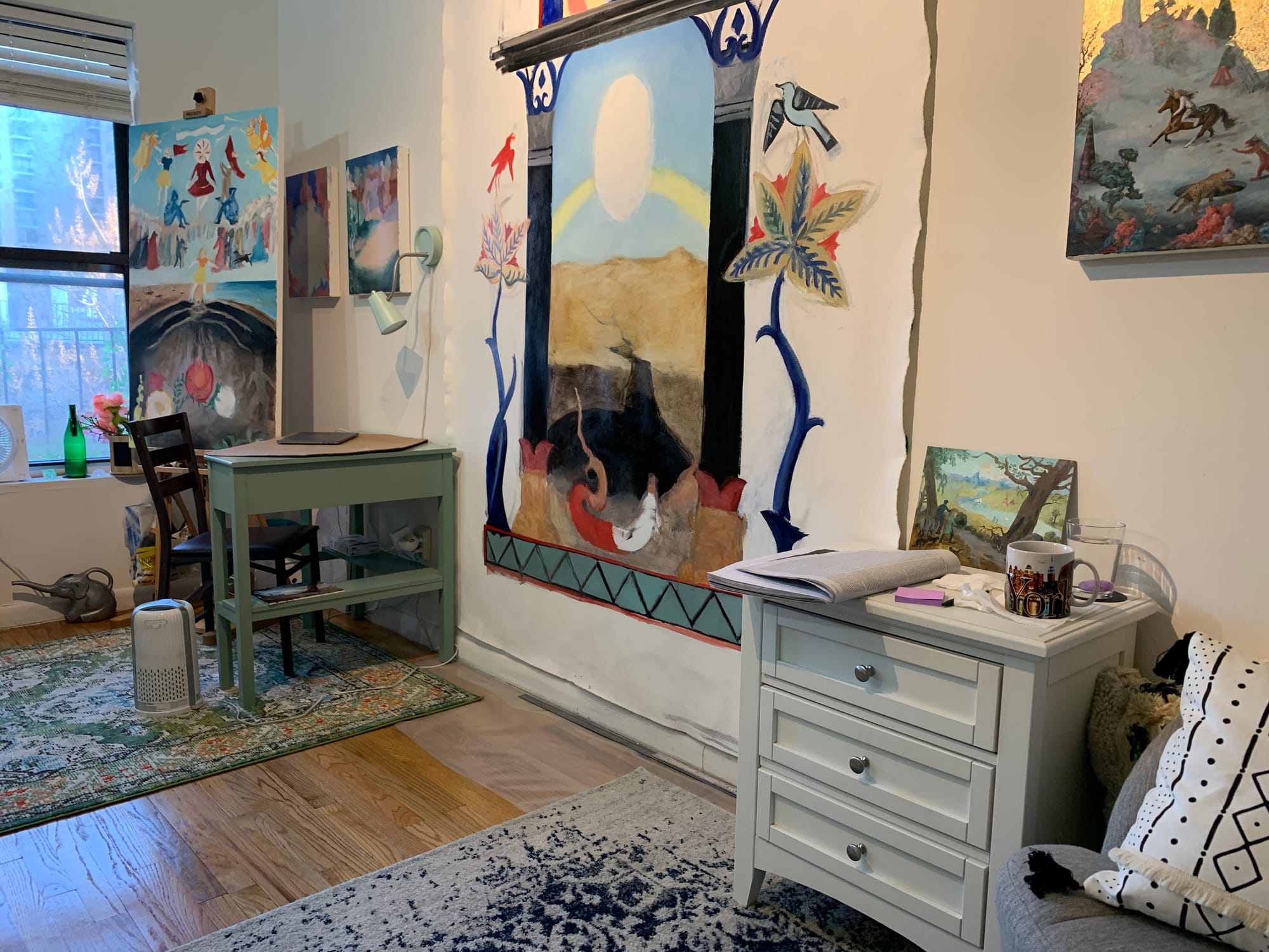 This is my cute new studio which is basically the living room in my one-bedroom apartment in Manhattan. I have a little nook by the window with my desk and my easel. I’ve recently started a new large-scale painting that will hang like a tapestry which occupies the entire height of my nine-foo-tall ceilings. I love to have coffee in the morning and read about art on the loveseat sofa to the right, where I sit and look at what I’m working on, then I start painting either at the easel or on the wall-hanging painting.
