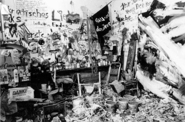 This is my workspace in an old bakery. The atmosphere just happened on company time. On the right are both my easels, behind the painting. A third easel is on the left. The ground is filled with old newspapers. Straight ahead is a long table for my painting materials and brushes. In the breaks from painting I have written some thoughts on the wall. It is just my creation progress, that is all. I cannot work if everything is tidy. That’s no life. I like this atmosphere.