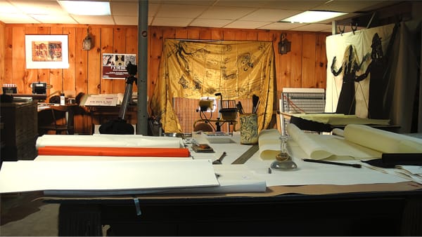 This picture was taken on a day where I’m in the process of making props for the theater. A large work surface (5’ x 9’) is in the foreground where I’m usually busy making drawings or cutting the shapes and silhouettes I use as props for the theater. Many drawings are worked out on clear acetate then used as shadowy scenery.