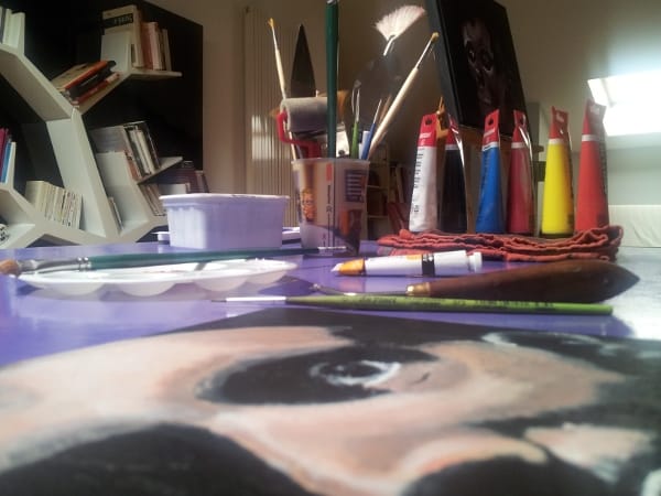 My workspace is also the place where I live. I have the chance to use a great loft, where I have been able to occupy a large corner. I work mainly on a table, as I generally paint on small canvasses.