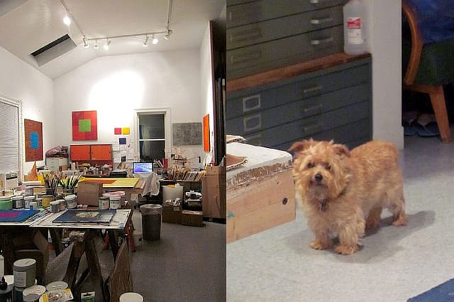 Two levels of built in storage racks are on the opposite wall (the lower level has old sheets covering it to protect the work from getting splattered — also gives me another place to hang work). Taller storage racks on top of my flat files by the entry. I’ve tried to use every bit of space efficiently. There’s a tall rack behind that door loaded with books and art magazines. My aprons and coveralls, and my gas masks, hang on the back of the door. My company during the day is Tony who reminds me when it’s time for a walk outside and his dinner.