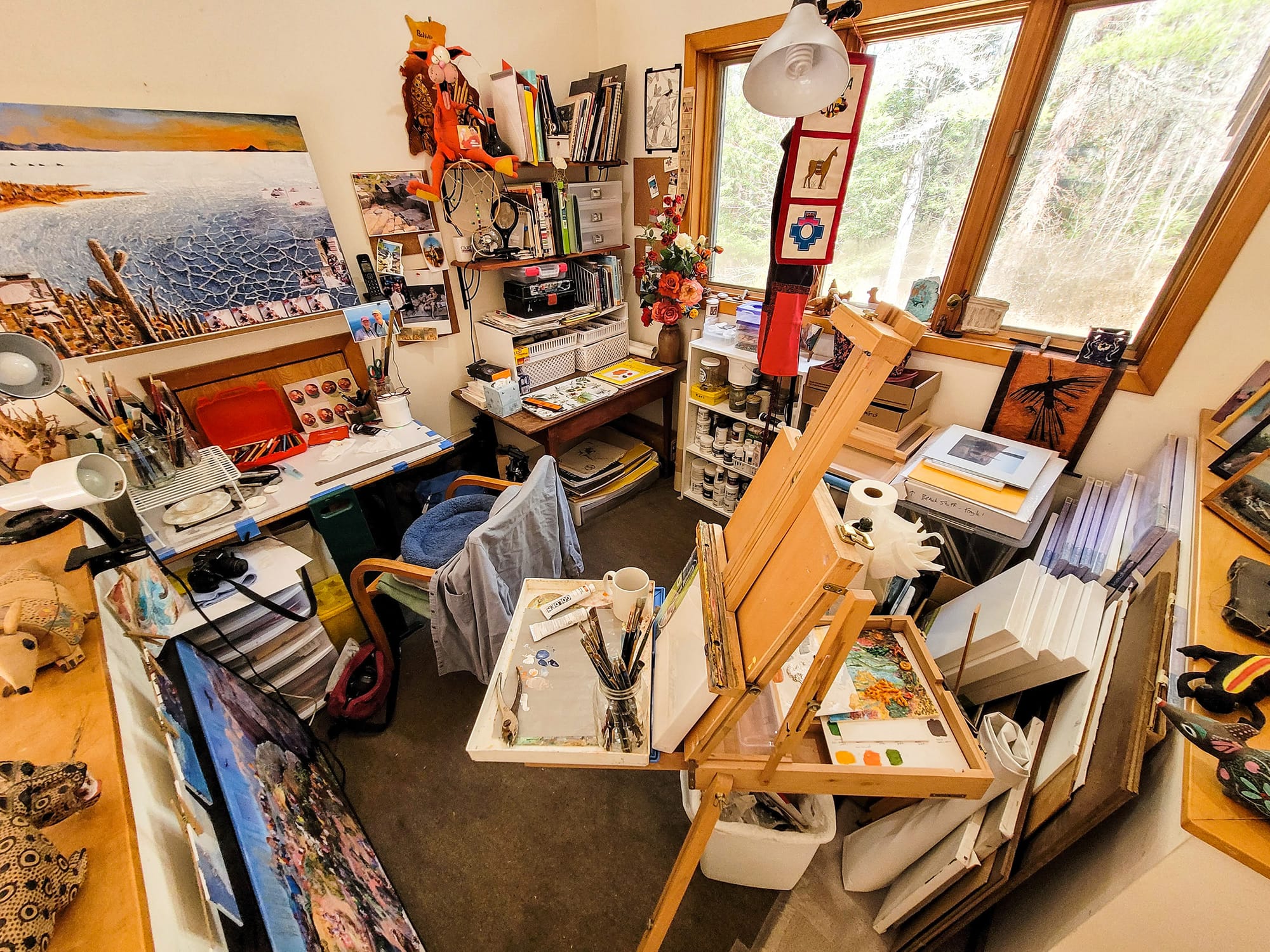 This is my studio — an actual loft, about 8 feet x 8 feet, overlooking my living room. It’s not much space, but since I don’t do very large pieces, I manage. I’m a multi-media painter so have shelves for books and papers and jars of media, drawers for tools and paints and pencils. I use a clothesline to hang photos, sketches, and little canvases for testing out textures. I lean canvases, boards and frames along the walls, stack pads under a table, pile boxes of molds and collected objects for inclusion in my paintings on the bookshelf, leaving just one small table for ruminating on my next pieces. Then I cram travel mementos on whatever spaces are left. The only things I miss are a sink — but I use one in a nearby bathroom — and my computer, which I use for photos, in my bedroom. My cat sleeps on the chair when he can — it’s the warmest place in the house. And the north-facing windows look into trees, especially pleasant when it snows. But as crowded as it is, my studio gives me a place to focus, to rein in my ideas, which otherwise would sprawl uncontrollably all over the house.