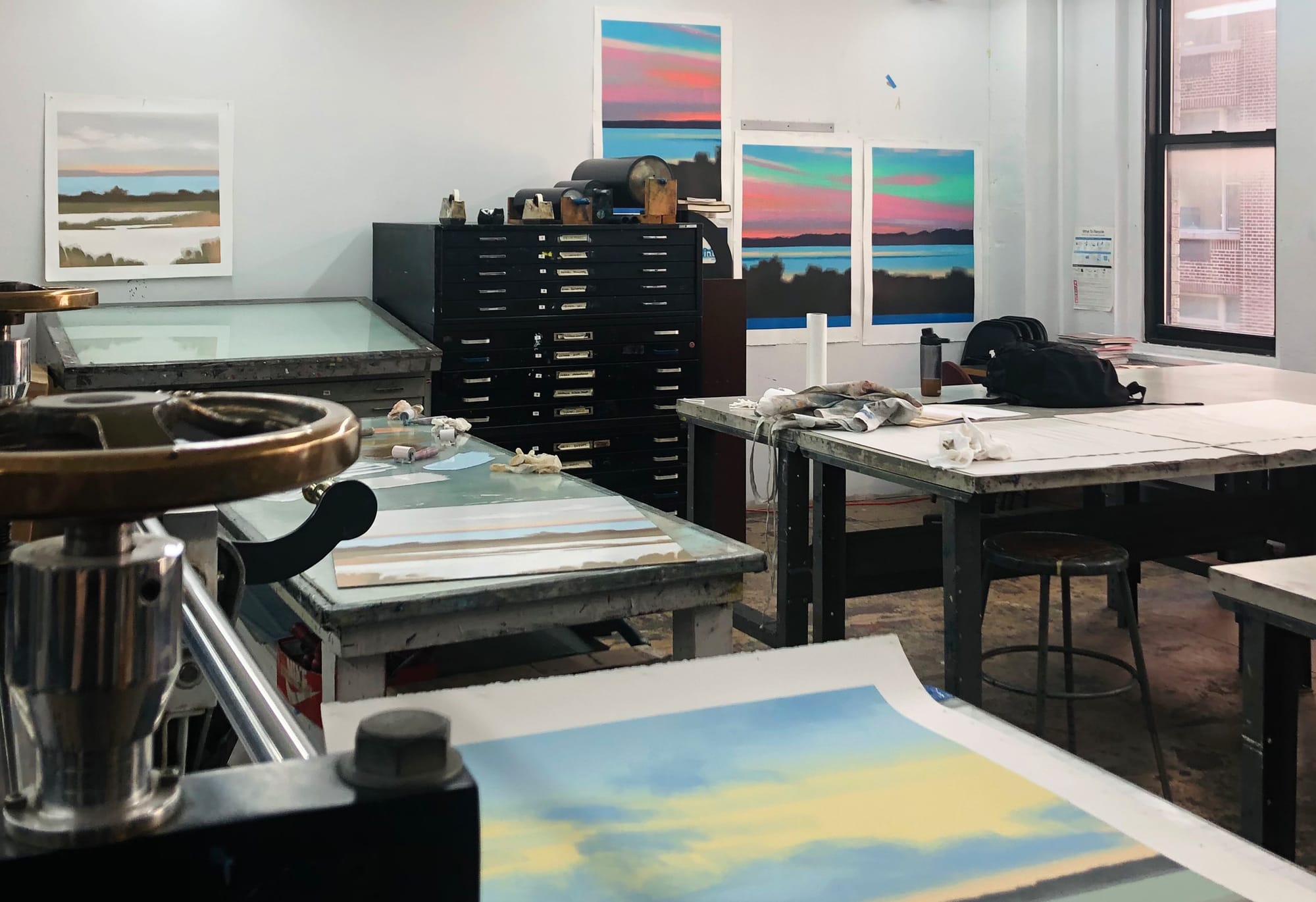 I live in New York City and work at the Lower East Side Printshop, a professional printmaking studio in Manhattan. On most days I arrive early in the morning, eat breakfast, mix my colors while listening to a podcast and the sounds of Eighth Avenue, and start painting. I work in monotype — a form of printmaking that yields a single, irreproducible image. My background is in illustration, and I love monotype because it straddles the line between printmaking/commercial art and more traditional "fine" art. Once I’m done painting, I lay a piece of paper on top of my image and run the whole thing through a printing press, creating a unique print. Each monotype is a bit like a performance: I make the piece in one sitting, and there’s no way to fix a mistake, so it really requires being in the zone. Working at a communal studio allows me to focus without feeling alone or isolated — it’s the best of both worlds.
