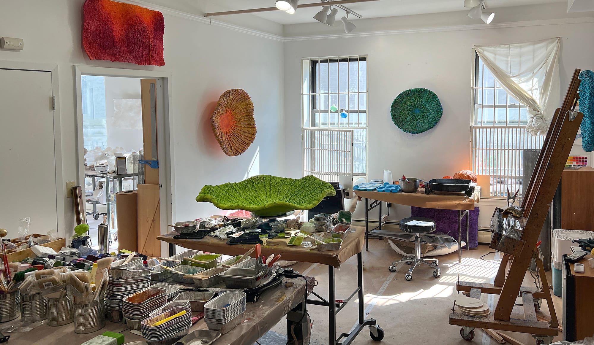 I build my three-dimensional forms from plaster over an aluminum wire mesh armature in the room you can see through the door on the left. Then I begin applying encaustic in the larger main space, working horizontally on a turntable, gradually building up texture through the process of accretion, layering multiple colors as I go. This offers endless possibilities for variations of texture, hue, intensity, luminosity, and character, which allows for a more complex visual experience that I hope will reward sustained looking.