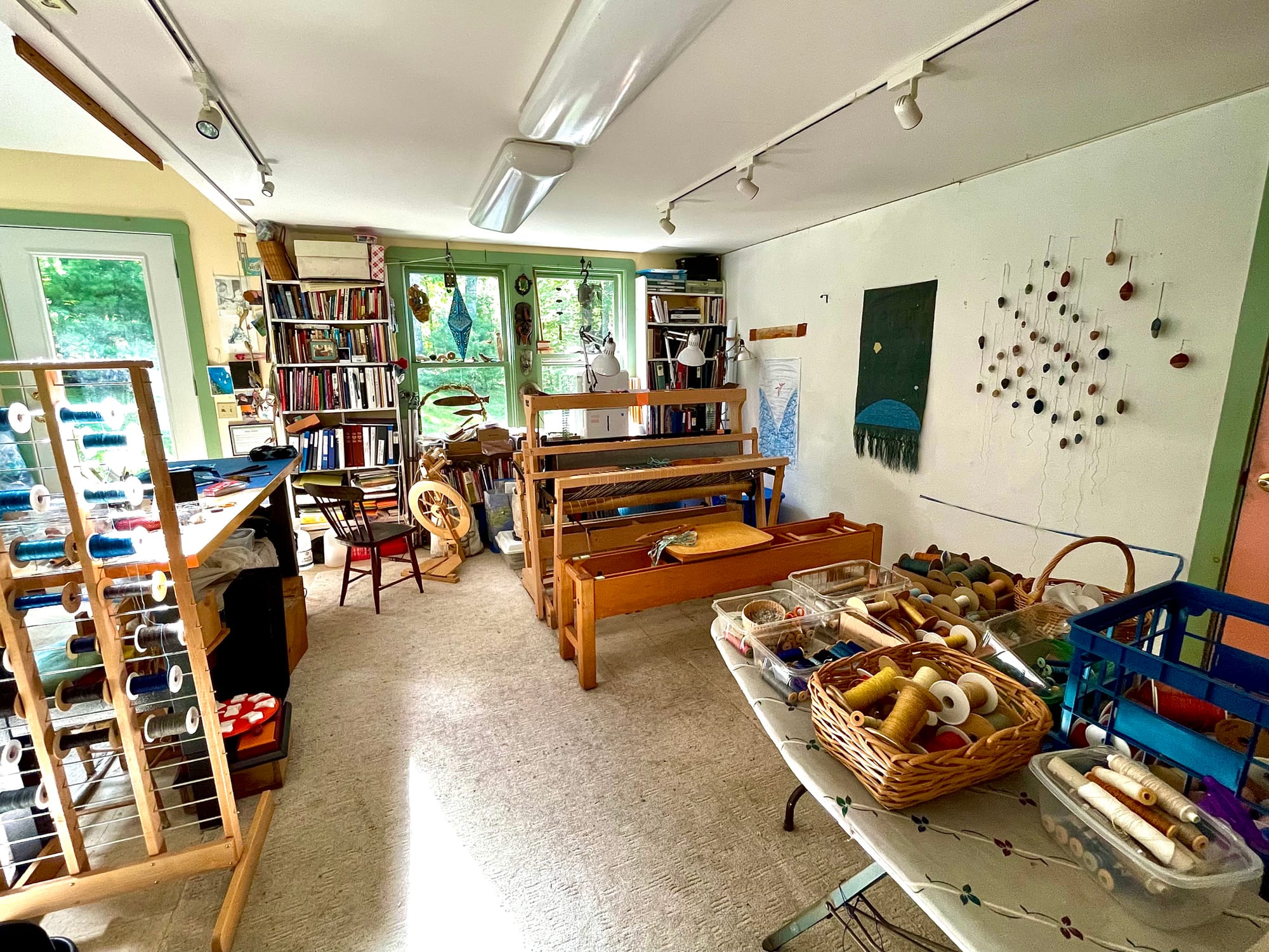 In the foreground, you will see spools and bobbins of my naturally dyed linens and rayons, which I use as warp and weft on my loom (seen in the center). To the left is my spinning wheel, which I use to spin paper and linen to augment the commercially spun fibers.