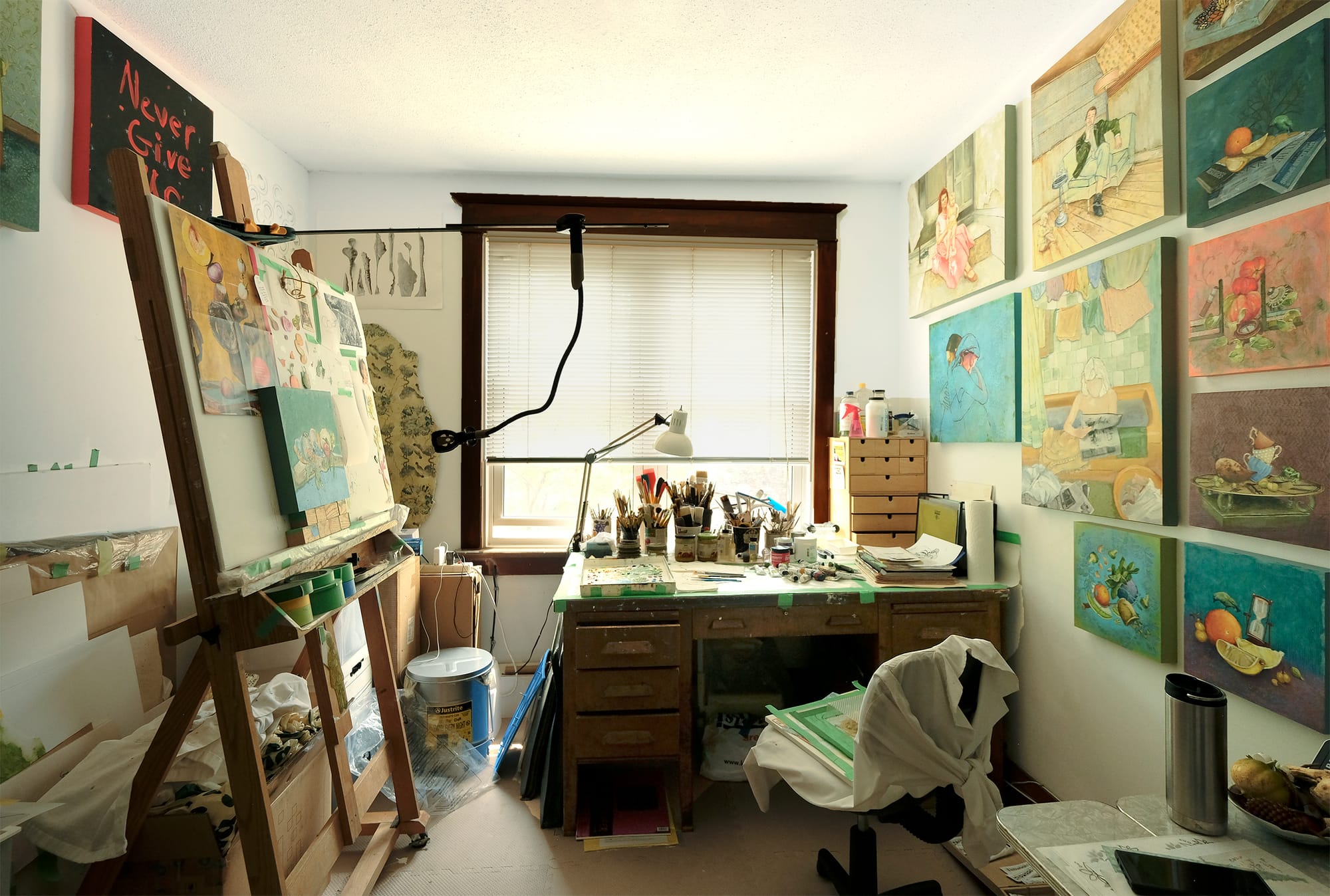 My studio is a small room on the second floor of my house. It has a south-facing window and an old desk that serves as a workspace and the spot where I keep most of my paints, brushes, mediums, and tools. To the left is the easel with a painting leaning against a board peppered with assorted references. Behind the easel and under the window are boxes full of artworks, and other equipment. Across the room, under the wall of paintings, sits an arborite table from the 1950’s. It’s a catch-all for temporary items and a place for my coffee and Bose speaker with an old cell phone attached that allows me to listen to podcasts while I work.