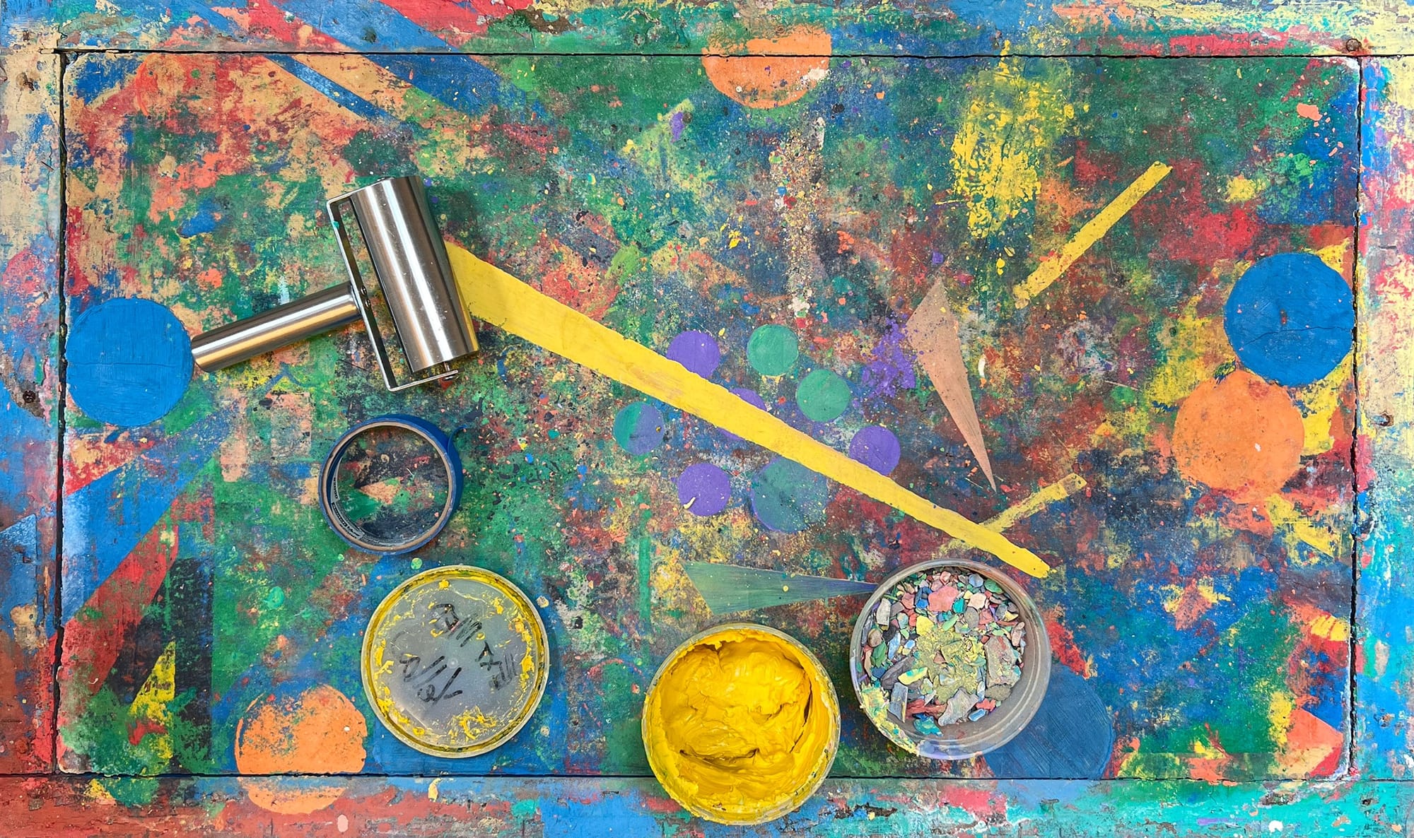 The blue painter's tape has several purposes, including making on-the-spot stencils if forming geometric elements.