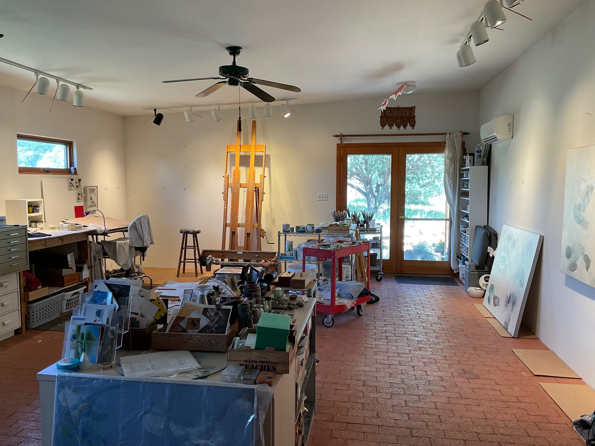 I work both at the easel and at the drawing tables on the left. On the right wall I hang paintings in progress, to look at them. The center station is a surface for taking notes on the music I’m listening to, or to write down ideas for future paintings. (Under this area I stash my yoga props.) On the left are flat files for works on paper. Behind the viewer is a storage area for paintings. High windows on the left face north; the glass doors face east.