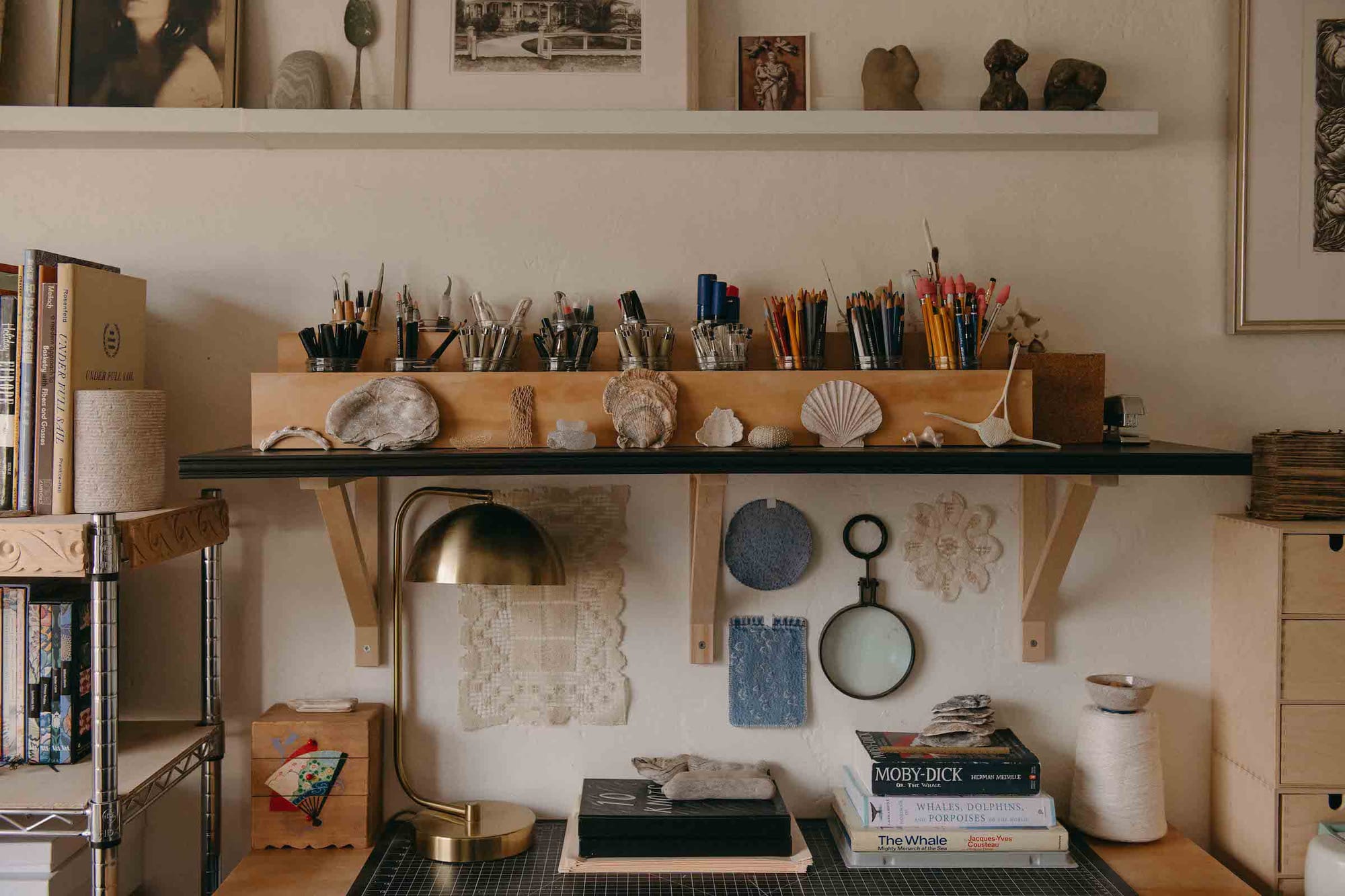 Welcome to the 223rd installment of A View From the Easel, a series in which artists reflect on their workspace. This week, artists bring yoga into the studio, turn to whales and seashells for inspiration, collect abandoned crochet projects, and walk us through the clay monoprinting process.