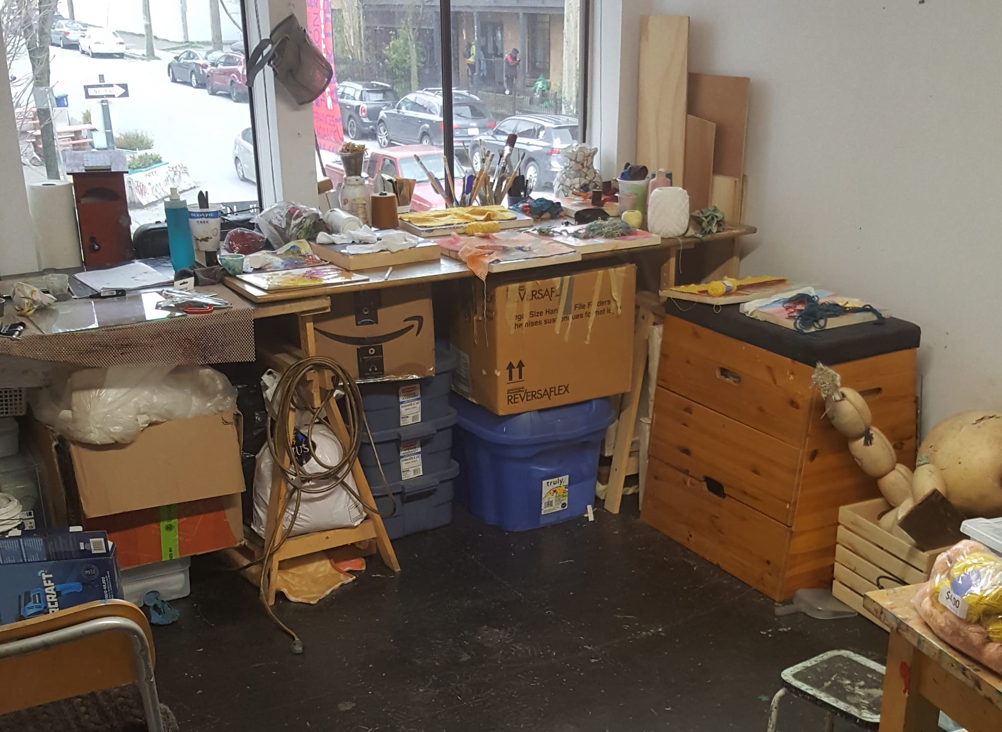 My studio is filled with art and materials made and collected over the years. I realized recently that I need never buy more materials if I re-purpose those already in my studio. I collect unfinished knitting or crochet projects I find in thrift stores and use them in collages and sculptures. Here I am working on a series of abstract collages using some crocheted pieces, adding them to wood panels, then adding some thread and paint to bring them into the language of painting. I like knowing that I can walk into my studio no matter my mood or length of time since I was last there and instantly start creating. This space is my sanctuary. While it is in a troubled neighbourhood in Vancouver, I feel calm and filled with creative energy when I am there.