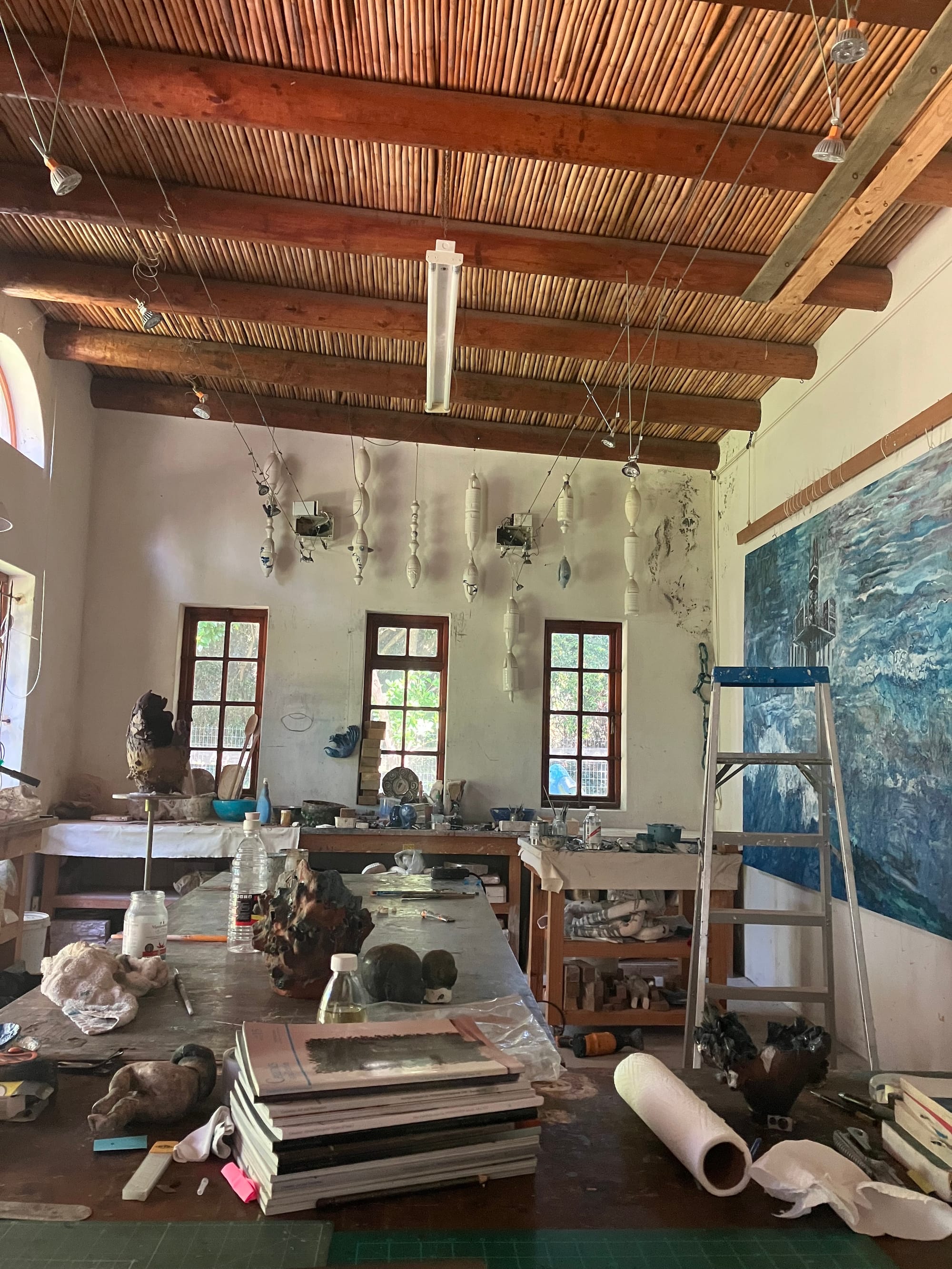 My studio is my safe space, my sacred space. It holds the extraordinary and ordinary. I look for those elements in my work. I am in my studio often after a swim in the cold Atlantic or in False Bay. That is around 10am. Then I am there for most of the day and write, as well. My practice is mainly clay and that's what I will focus on, alternating with writing. I have a garden outside with free-roaming rabbits, cats, peacocks, and lots of birds and squirrels.