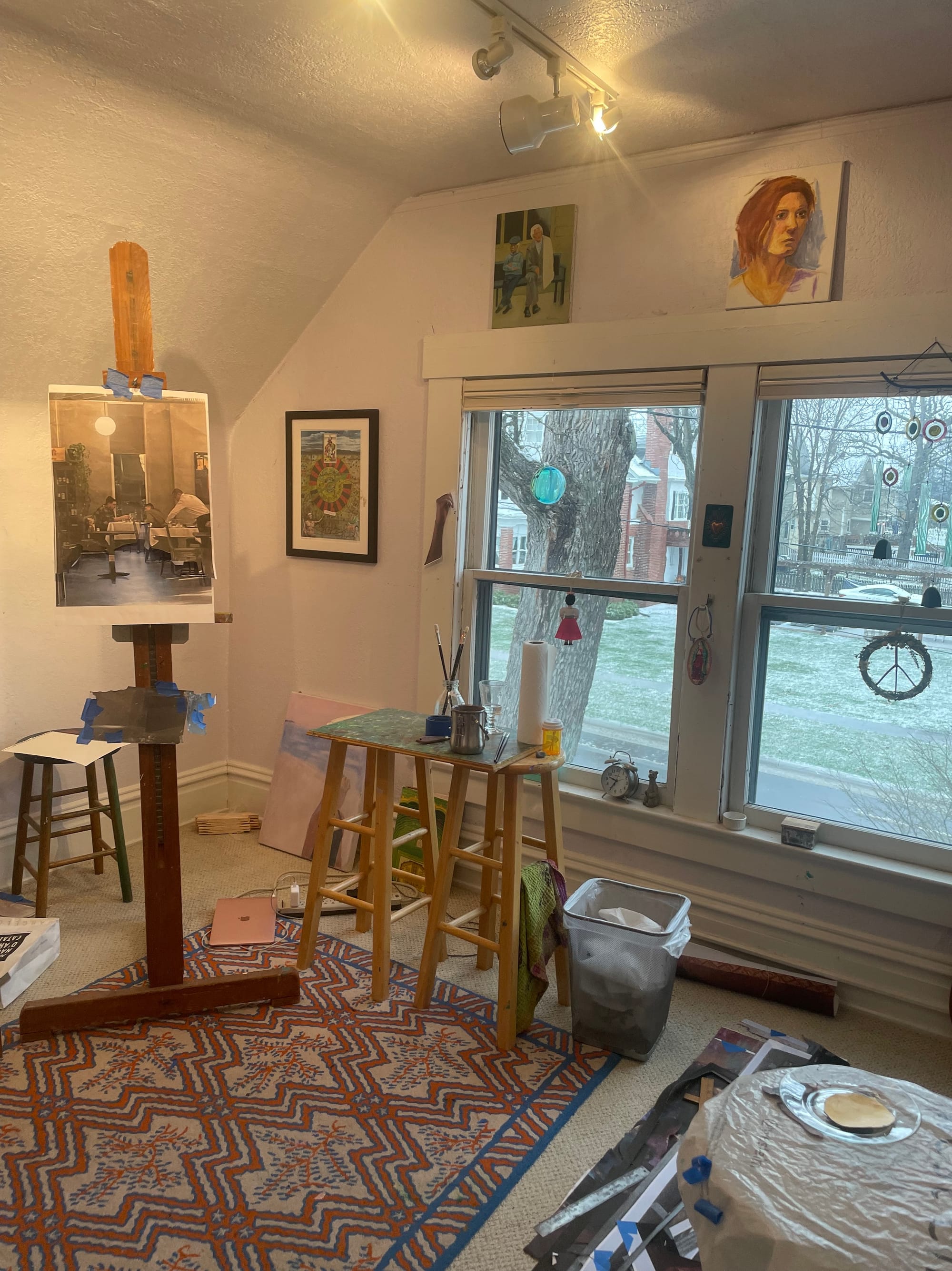 I love my studio, going from organized to chaos, depending on what stage of the painting I am inhabiting, sometimes even stepping on reference photos and rulers during my session. I look out of the north windows and see the change of seasons following the light and shadows.