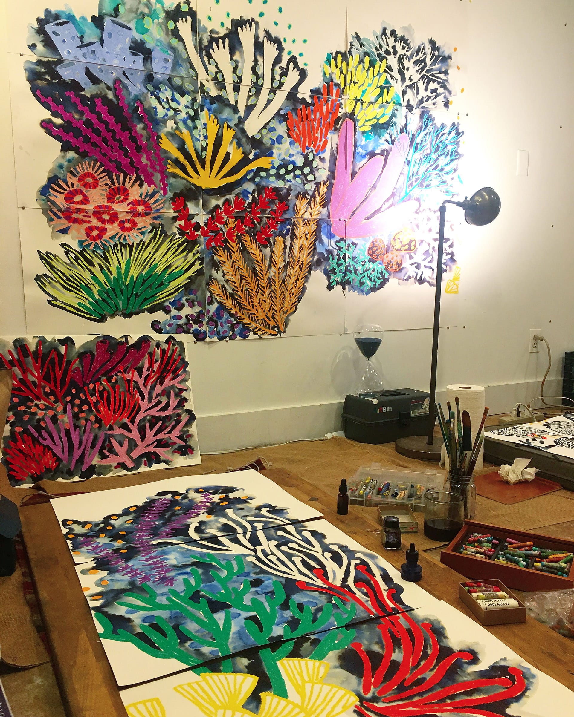 Having my studio in the basement has a noticeable impact on my creative process. I have to take advantage of every surface I can, so I work on the floor and on the walls at the same time. I also find that my work tends to be more vibrant and colorful when I'm in that space. When I create art in other locations, such as while traveling, I observe a shift in the tones. Also, the low ceilings in my basement studio can be challenging when I try to create large-scale pieces. Now that I’m making more large works, I see myself struggling with limitations of space. I have to work on only one at a time, and I have to clean and organize right after using each corner of the studio.