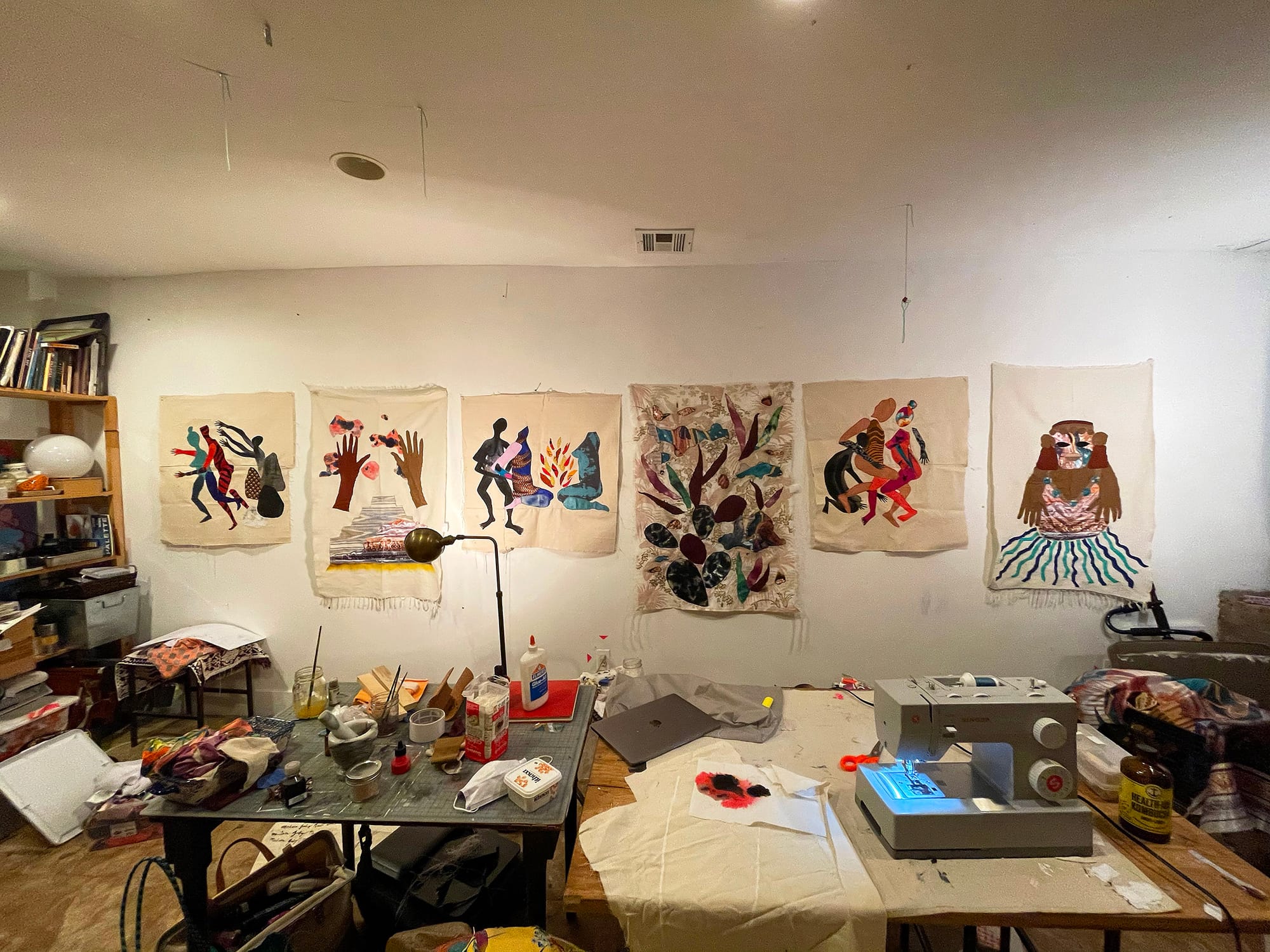 I usually hop on my bike or catch the G train to my studio, where I arrive after lunch, though if a deadline demands it, I'll head there right after breakfast. I usually work on several pieces simultaneously, often belonging to the same series, allowing ideas to cross-pollinate and evolve together. I avoid working on silence, and when the pressure is on, music helps me with a rhythm, pushing me into a productive flow. When I can take it easy and have more mental space, I listen to podcasts. I also have a record player so I love the ritual of choosing records. I like using a sand clock; it helps me not get as distracted with different tasks.