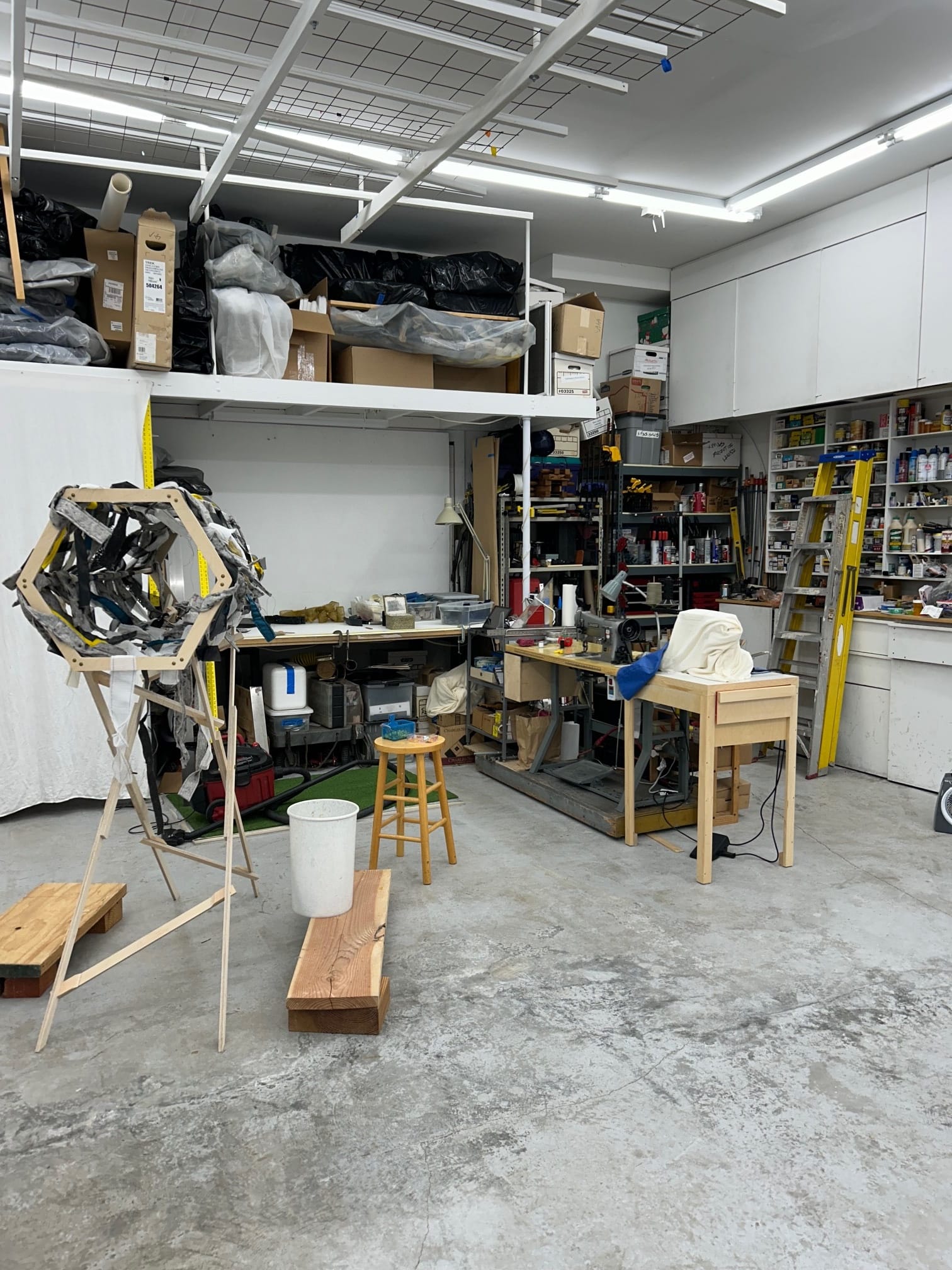 Because of the 12-foot ceilings, I can suspend work from the ceiling and work at a large scale. I've got a good range of LED light so the space is always "sunny." Everything I fabricate breaks down and there's room for storage under the ceiling above my work table. There's enough room for my industrial sewing machines, welding equipment, worksite table saw, drill press, and tons of hardware and tool chests.