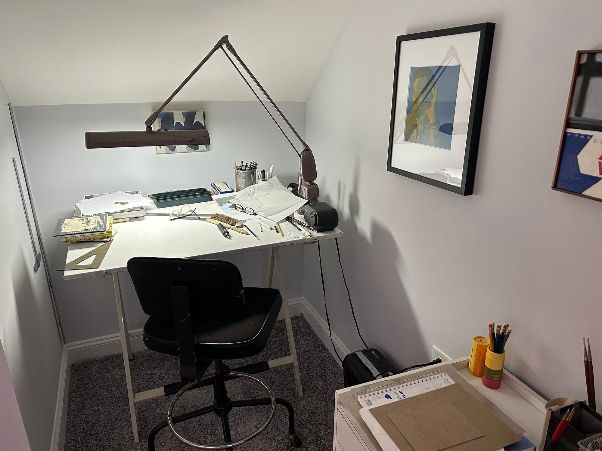 My home studio is somewhat small but it's well organized. I have four workstations: two for painting, one for drawing, and one for researching, proposals, and any digital imaging. I do enjoy working on several pieces or projects at one time and having these separate stations makes it seamless. Before working from home, I had several studios in large art buildings. Befriending other artists over the years was a joy but sometimes the everyday noise was distracting.