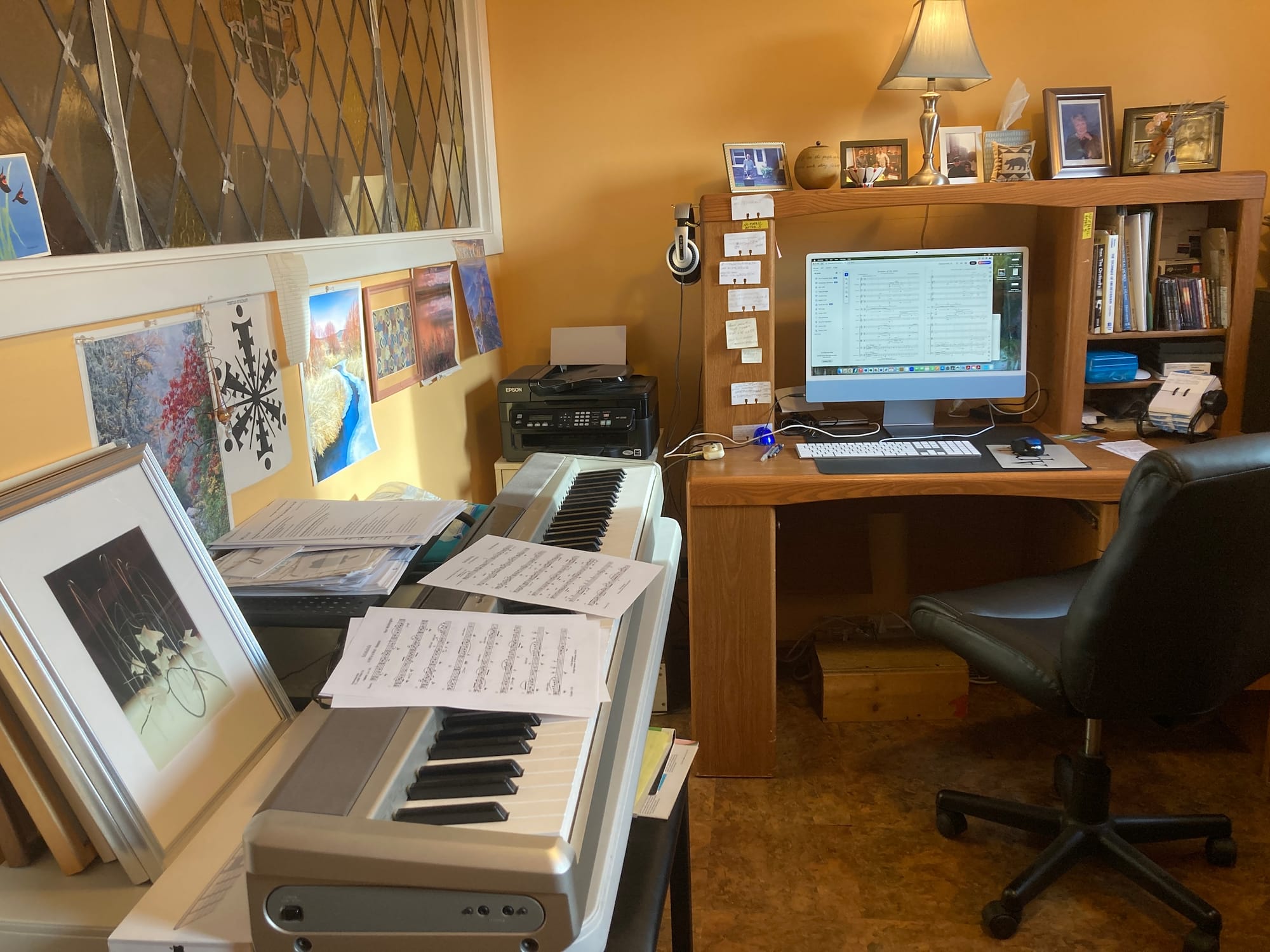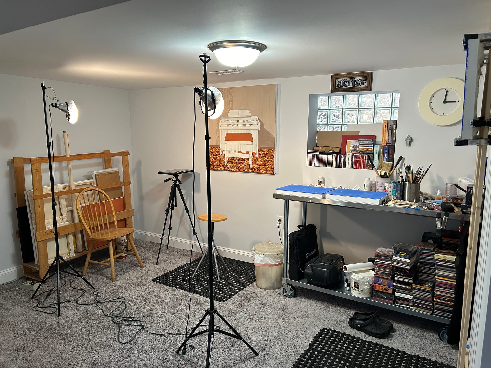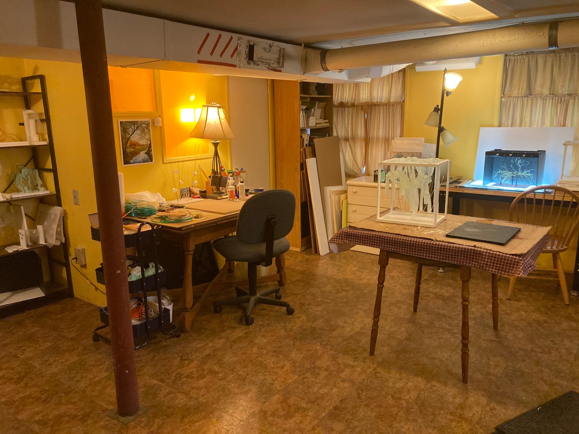 In 2023, expanding from my years as a composer of concert music, I re-embraced an earlier passion for sculptural spaces. My creative workspace has now evolved into two spaces: my music studio of 20 years and a new sculptural studio. The music studio is a small room on the main floor of the house, while the sculptural studio is in a partially finished lower basement level. It has windows, a low ceiling, exposed pipes, heating ducts, and its own entrance.