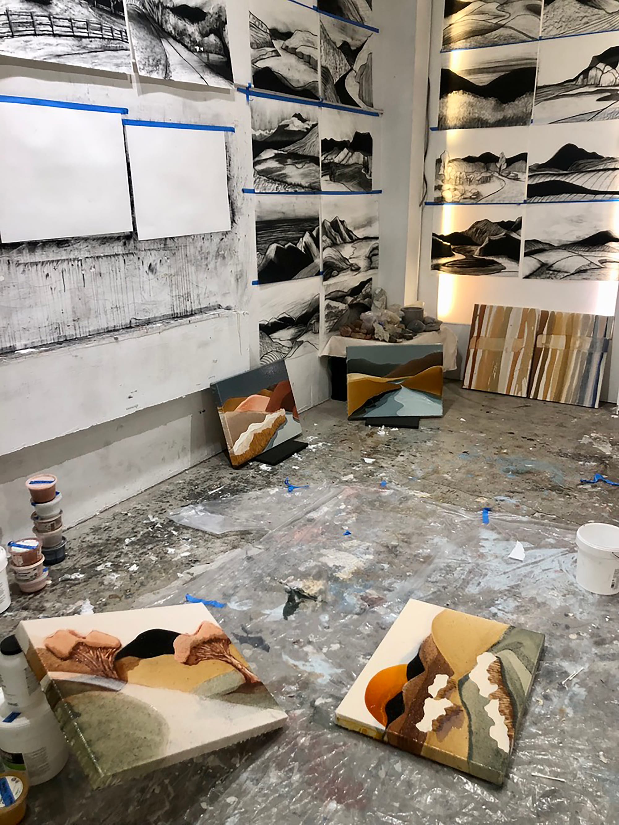 I love being immersed in my landscapes. I want to feel like I am in one of my paintings, and having my drawings and pigment library (where I catalog all the colors I've gathered in nature for the paints I make) available to reference for interesting palette combinations really inspires me. I love having rocks and soil from specific terrains at my fingertips to remember the beautiful places that I experienced while gathering earth color. All of this feeds my sense of place.