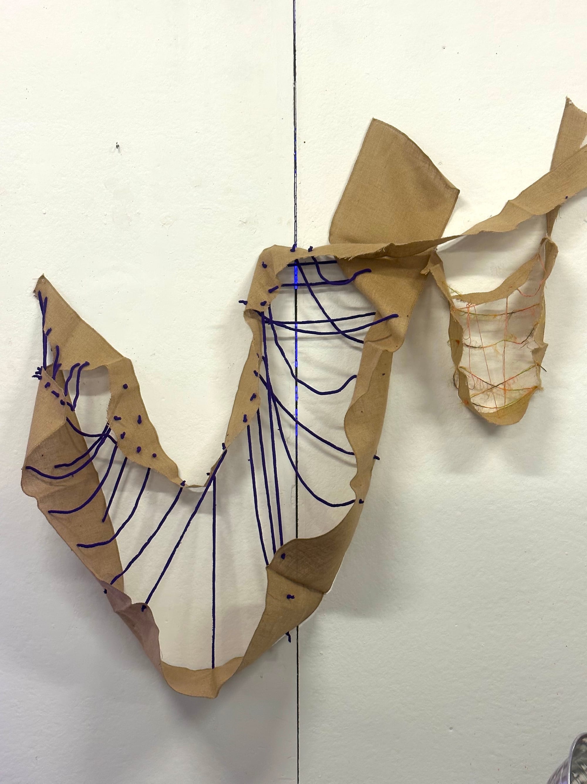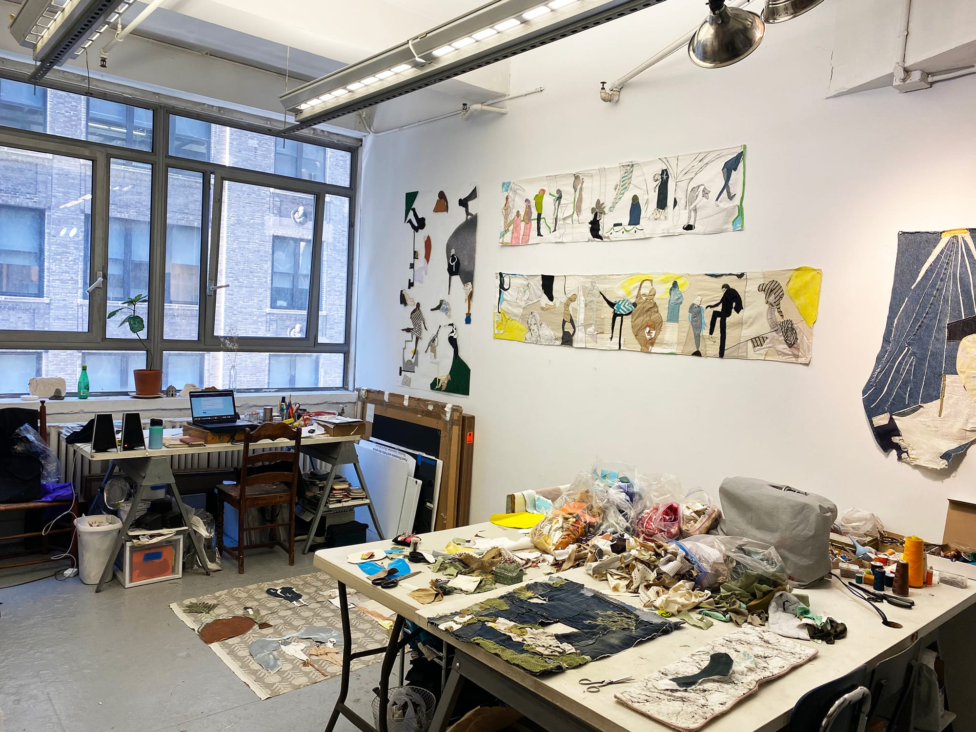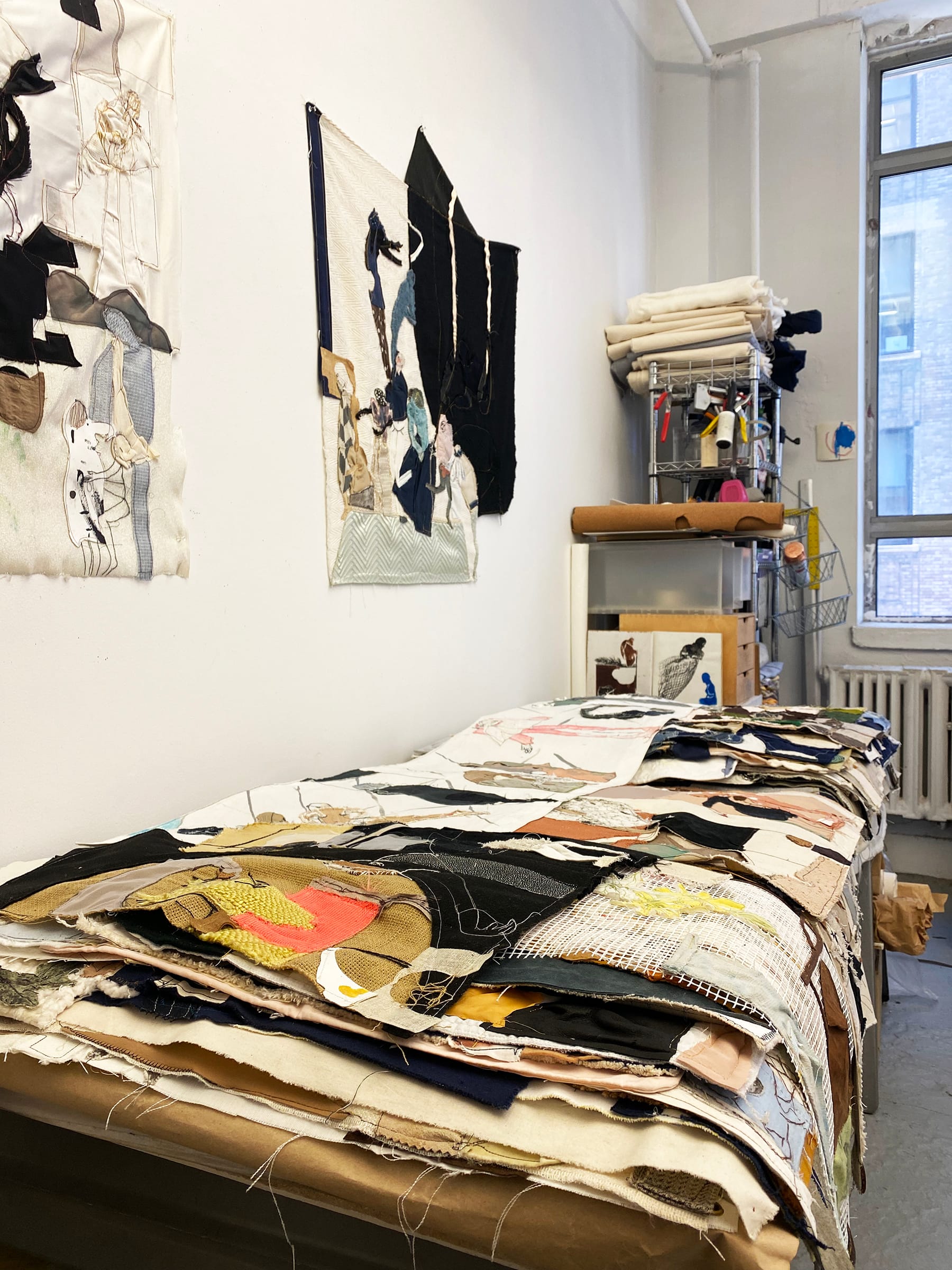 As a teaching artist, I'm always on the go, and my studio time shifts around my classes throughout the day; but preferably, I like to work in the afternoon and evening when the sun is crescendoing to absorb the beauty of the golden hour. I take the train from Brooklyn to Manhattan and then take the ferry to Governor’s Island. I love the ferry ride over, because it transitions me physically and spiritually from the intensity of the city to the magical space of the island. That short ride is the liminal space I need to prepare for a day in the studio. Once there, I stay and work as long as I can; moving from painting to textiles to installation within the space. I usually listen to playlists that are high-energy punk and new wave, or enchanting melodic songs that feel trance-like and meditative.