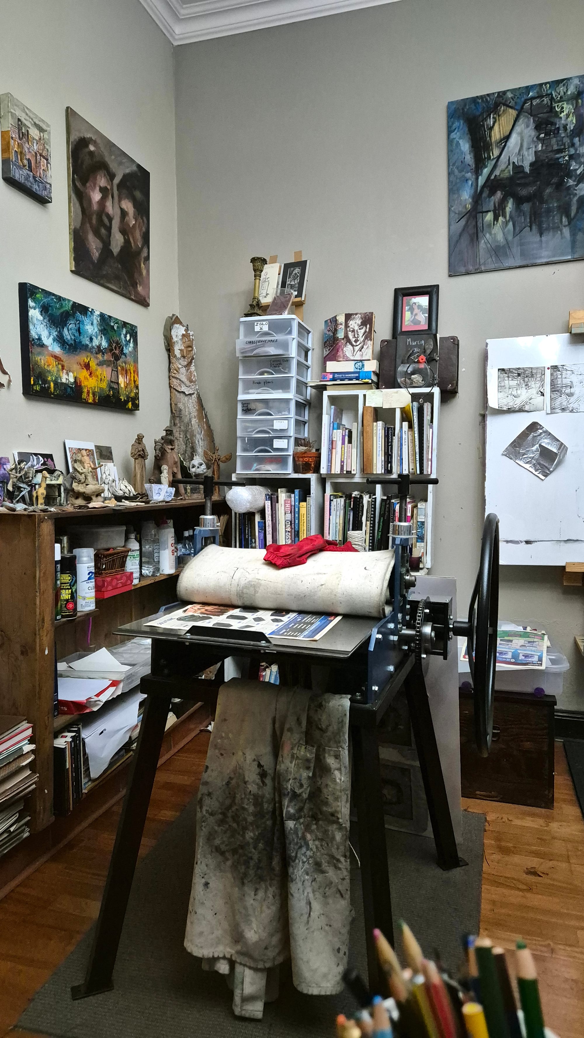 I love my studio simply because it offers me my second life. It's a space that is safe and familiar. I am surrounded by everything I love: paint, paper, tools, sculptures, rocks, wood, quiet serenity ...