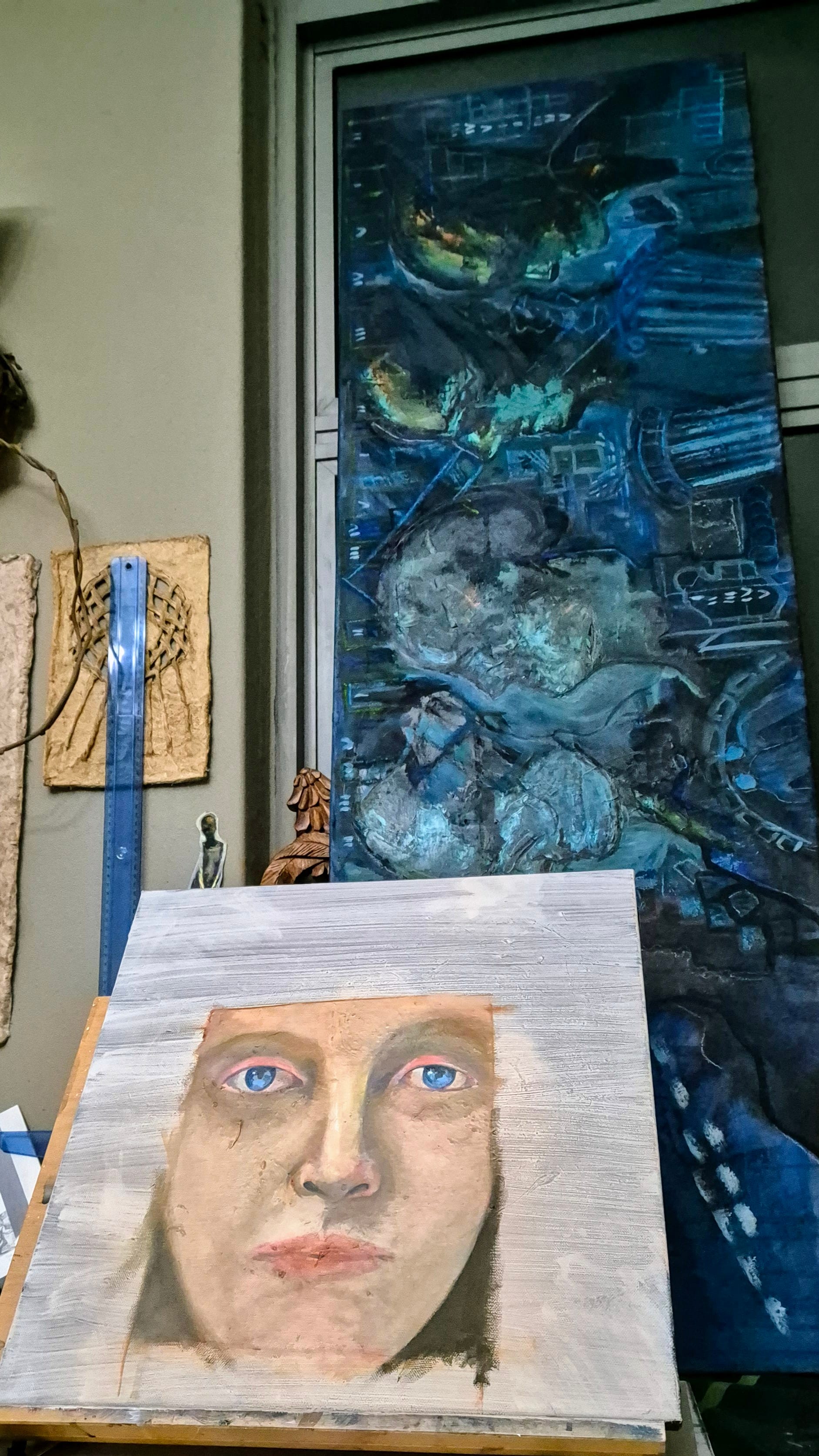 The studio is a lounge in the house that we do not use. I close the door to one world and move into another one filled with creative prompts and the smell of oil paint. The space is filled with pieces I have collected over a period of time: sculptures, books, wood, and rocks (I am an enthusiastic hiker). My studio is a reflection of my interests and objects acquired over the years. I can quietly sit and observe. Everything in my studio reminds me of places, times and days lived ...