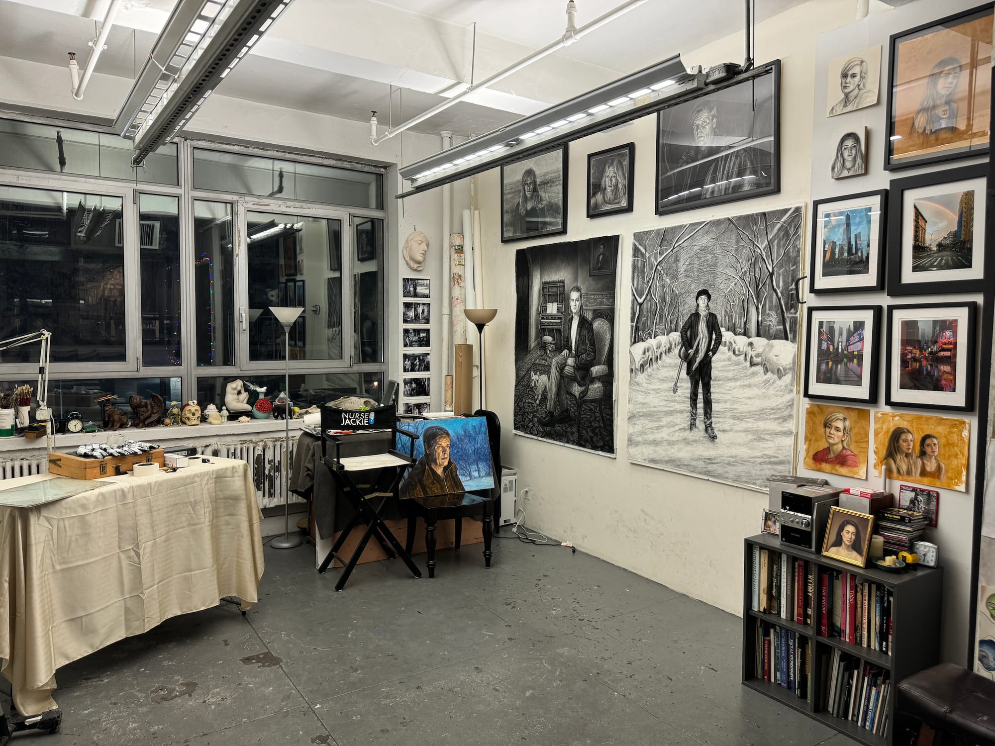 I stay up late so I sleep in and arrive at the studio around 1pm. I ride my bike from the east side of Manhattan to the Garment District where my studio is and I ride home at 11:30pm. When I arrive at the studio, I will attend to my computer obligations, check my social media, perhaps lunch, and then begin to work. I usually have a couple of different projects going at one time. One of my large drawings, and perhaps a couple of smaller oil paintings. While I’m working, I listen to either music, the radio, audiobooks, or podcasts.