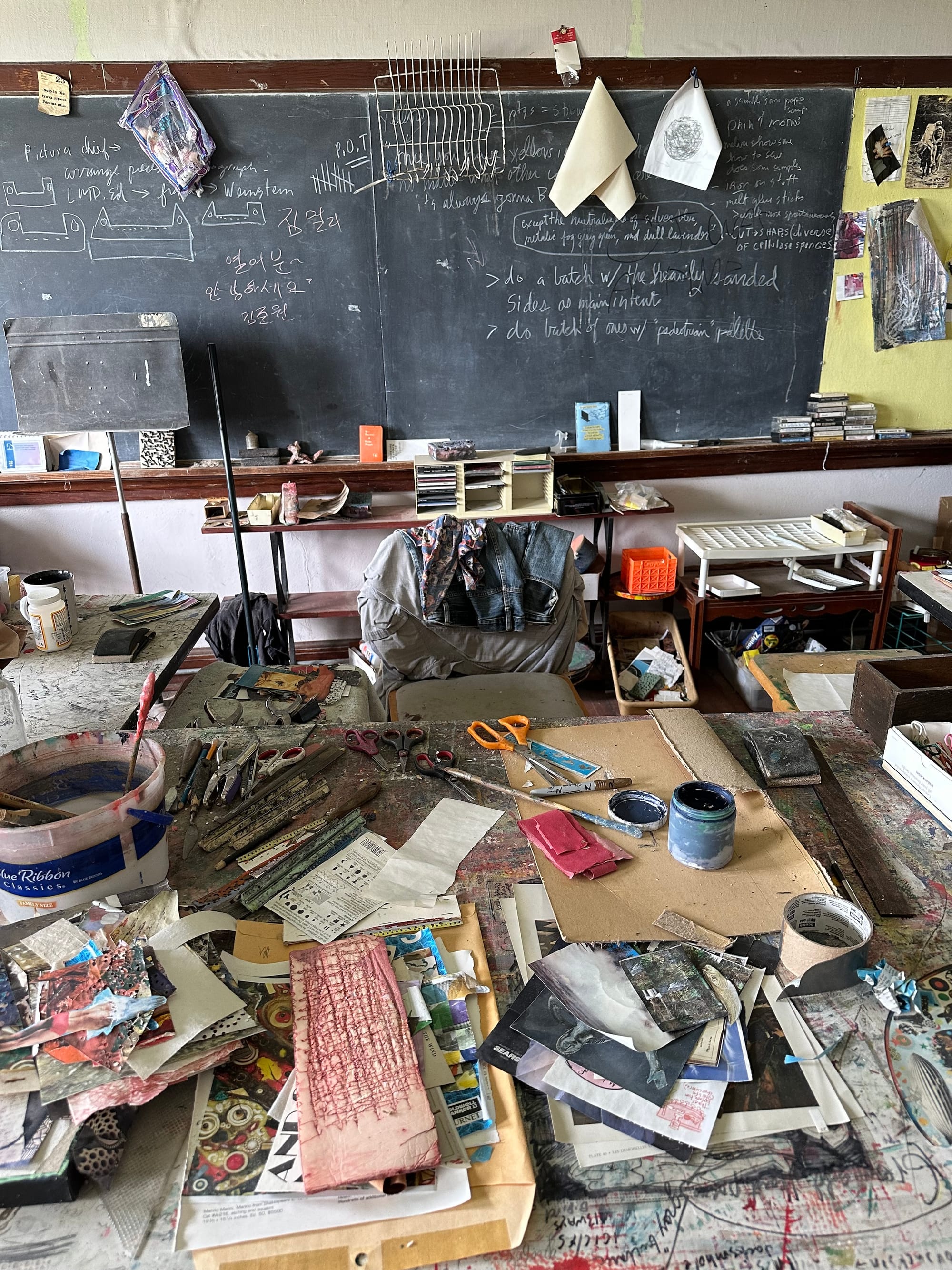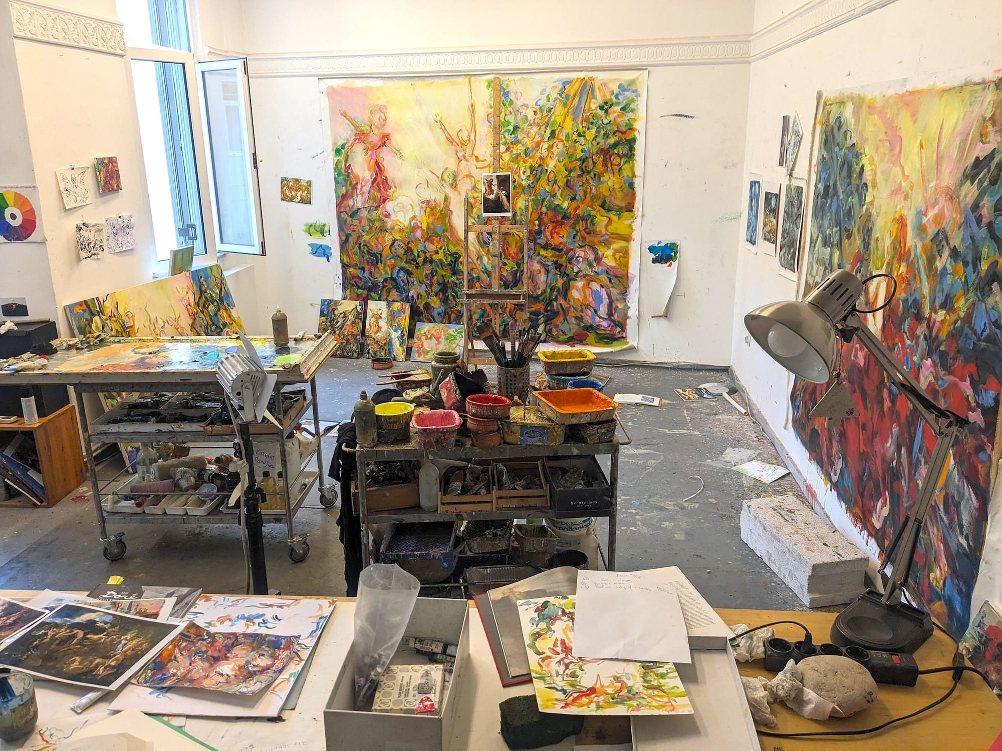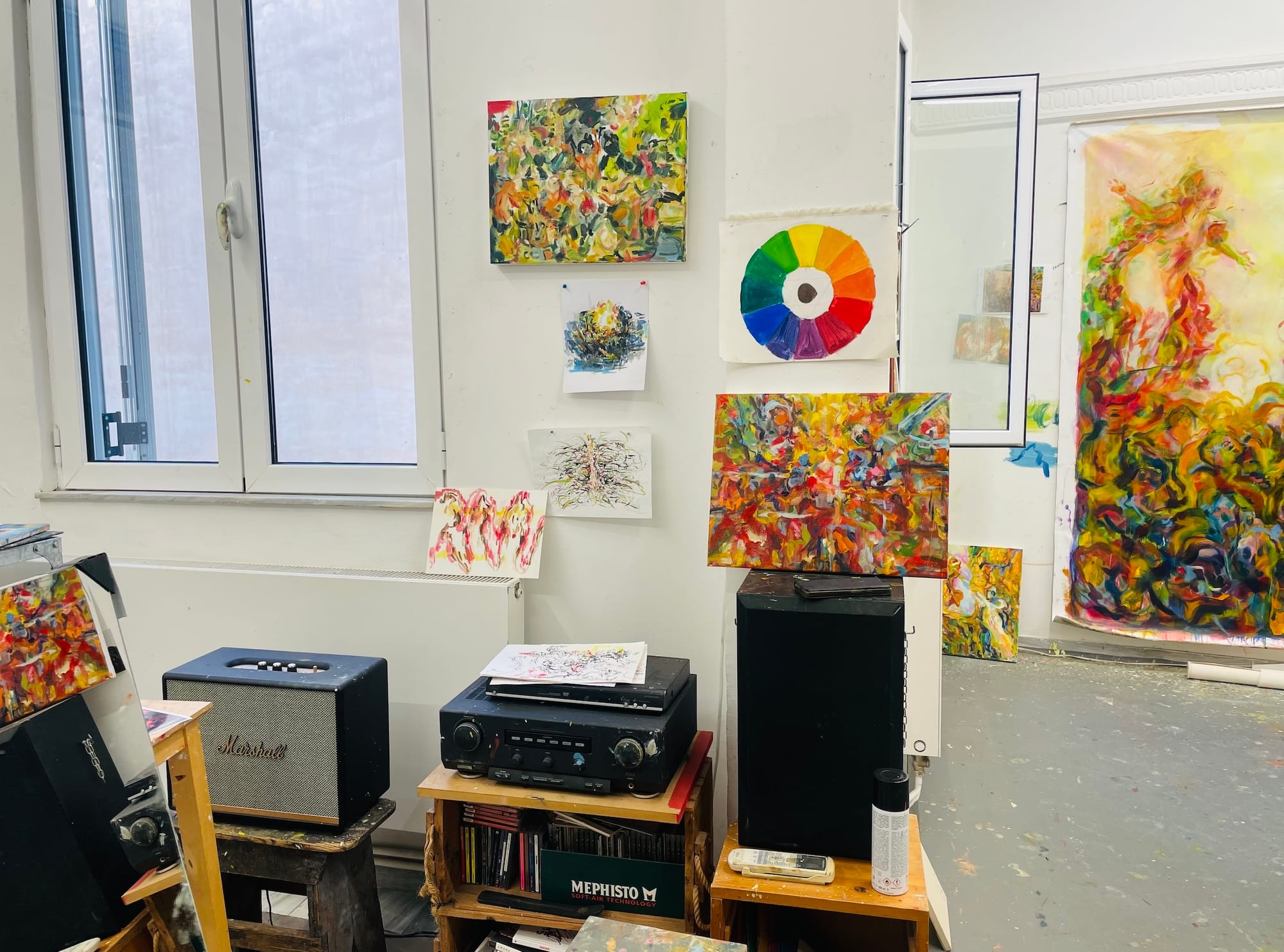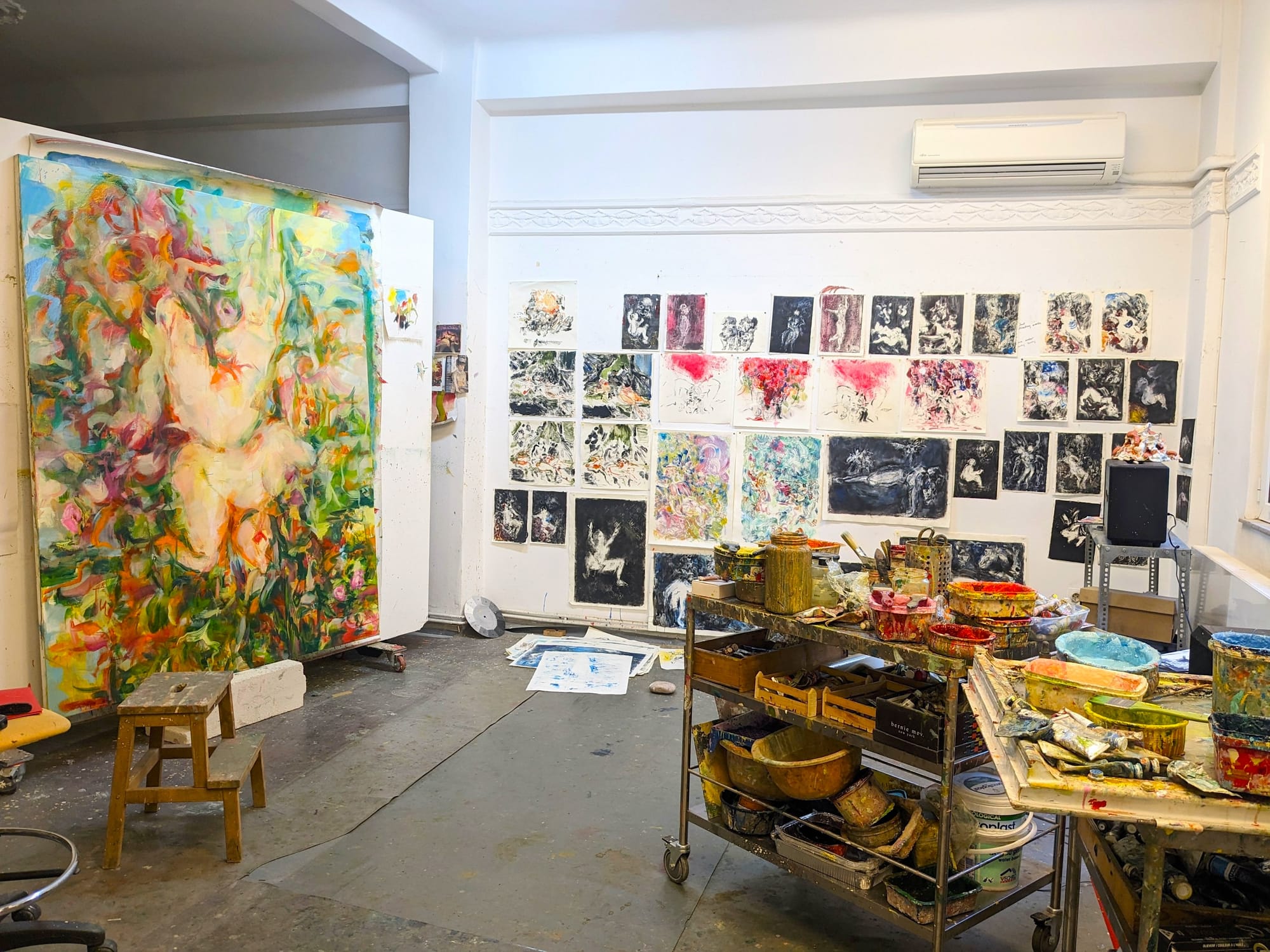 I consider the studio to be a co-creator of my work, and the container for my actions. There are two separate spaces with completely different dynamics, and their interaction reflects my work and process. The front room is where I draw, read, and relax. It is relatively tidy and quiet. I paint in the back room, where it's always messy and the energy is loud. I am constantly moving when I paint, zooming in and out of the works. The studio gets crammed so that one piece informs the other, and the boundaries between them become fluid.