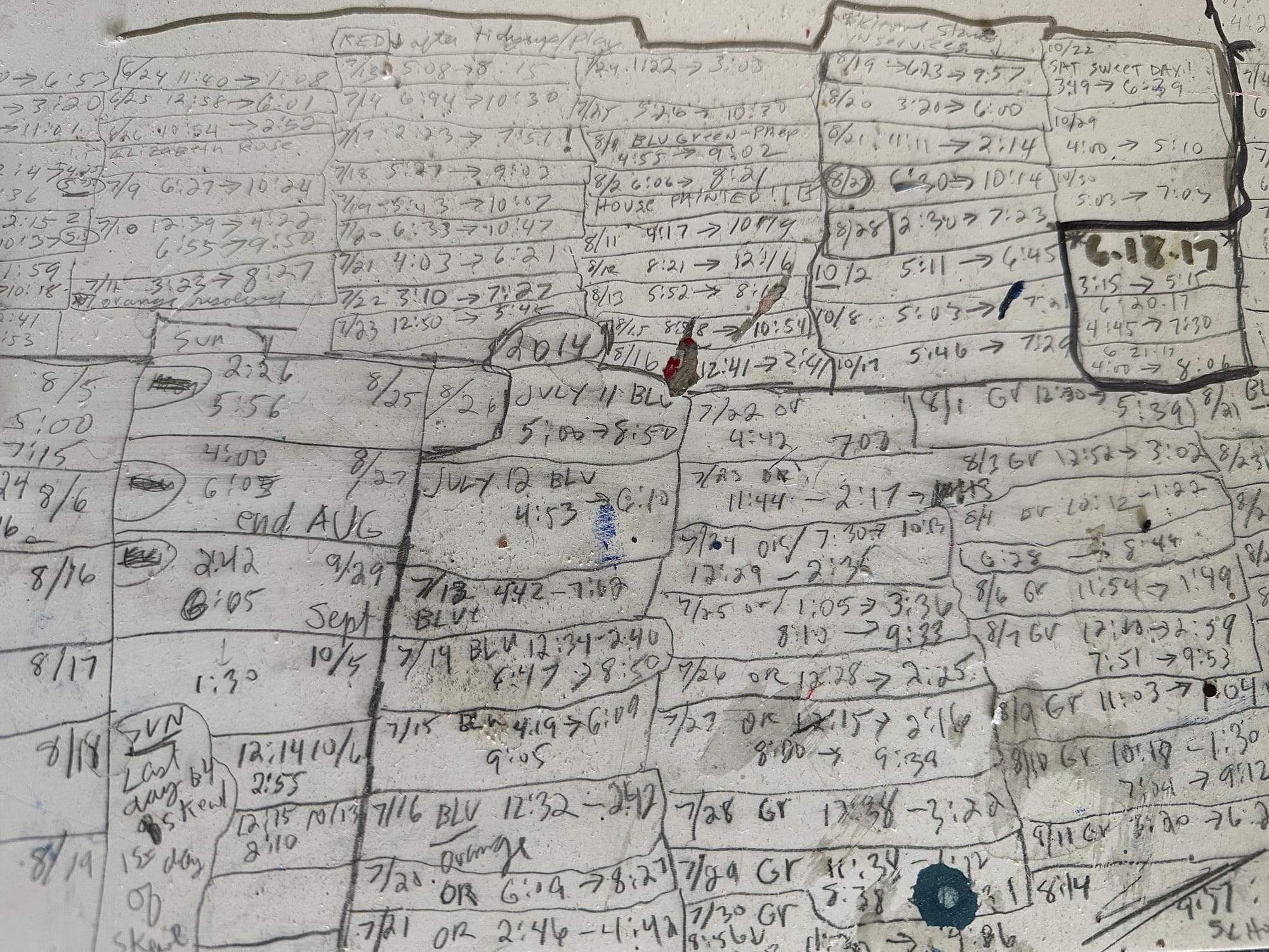 Some decades went over daily — see the photo of the date and hours worked written on a table — and I work on several pieces at a time. I typically listen to music turntable LPs: blues, jazz, rock, classic country.